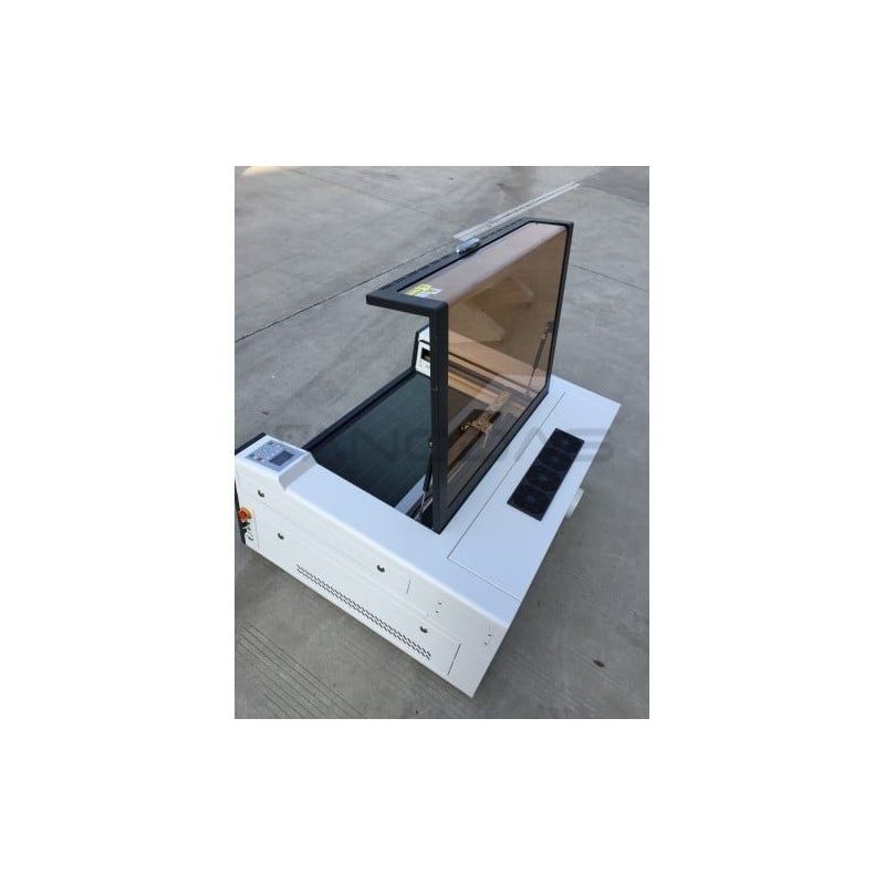 Darba laukums ir aptuveni 900 x 600 mm, Z ass augstuma novietojums ir 150 mm, tāpēc jūs varēsiet uzņemt ne tikai lielāku izstrādājumu, bet arī papildu rotācijas manipulatorus vai citas kustības asis. Griešanas pamatne ir nomaināma, un to var izgatavot no poraina materiāla vai speciālas griešanas pamatnes, kas ir vēl izturīgāka pret nobrāzumiem griešanas darbu rezultātā. Caurumi pamatnē ļauj droši izvadīt griešanas dūmus un neuztraukties par lāzergriešanas darba virsmu. Nepieguļošus priekšmetus vai garākas plāksnes var ievietot, paceļot vāku, gravējot tikai daļu izstrādājuma.