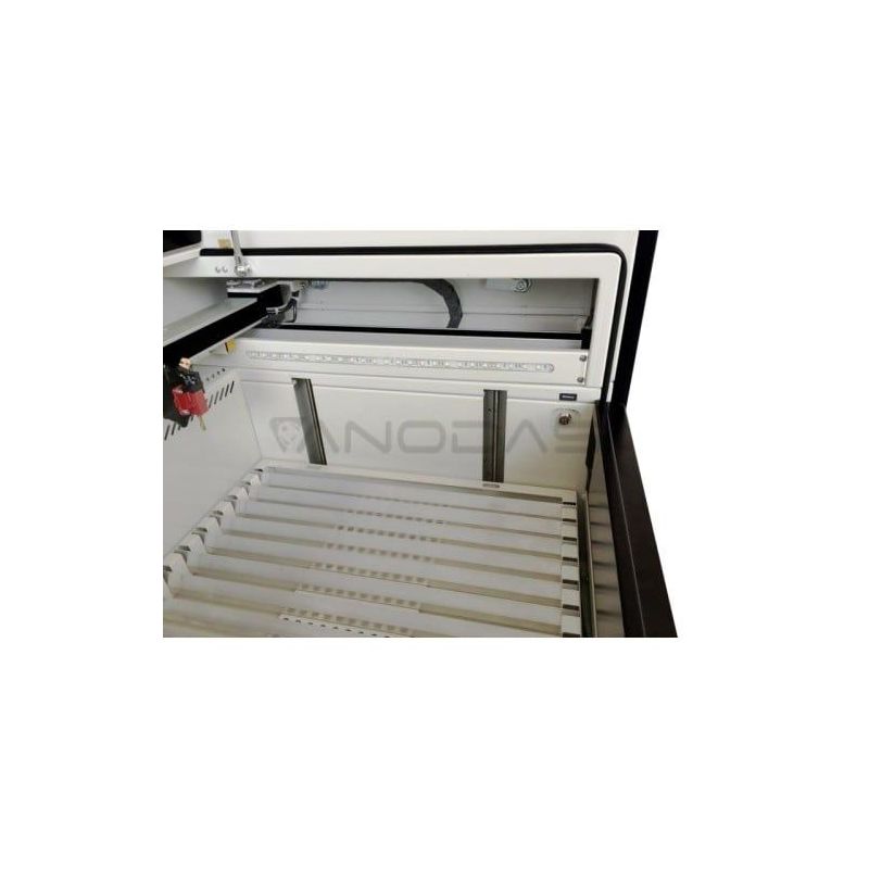 Darba laukums ir aptuveni 700 x 450 mm, Z ass augstuma novietojums ir 150 mm, tāpēc jūs varēsiet uzņemt ne tikai lielāku izstrādājumu, bet arī papildu rotējošos manipulatorus vai citas kustības asis. Griešanas pamatne ir nomaināma, un to var izgatavot no poraina materiāla vai speciālas griešanas pamatnes, kas ir vēl izturīgāka pret griešanas darbiem. Pamatnē esošie caurumi ļauj droši izsūknēt griešanas dūmus un neuztraukties par darba virsmas drošību. Neatbilstošus priekšmetus vai garākas plāksnes var ievietot, paceļot vāku, gravējot tikai daļu izstrādājuma.