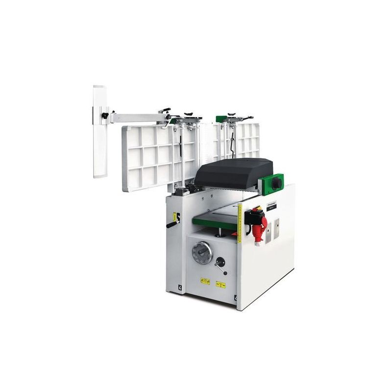 Vienlaicīga izlīdzinošo galdu salocīšana ar atsperu atbalstu ātrai un vienkāršai pārorientēšanai uz biezuma ēvelēšanu dažu sekunžu laikā