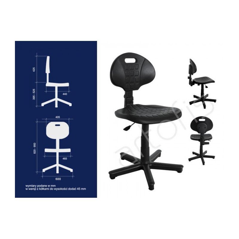 Grozāmais krēsls – darbnīcām, kasēm un speciālistiem. Sēdeklis un atzveltne ir izgatavoti no mīksta, neslīdoša poliuretāna. Viegli tīrāms. CPT mehānisms ļauj regulēt atzveltnes leņķi. Standarta augstuma regulēšanas izpildmehānisms. Pamatne ir izgatavota no poliamīda ar pievienotu stiklšķiedru.