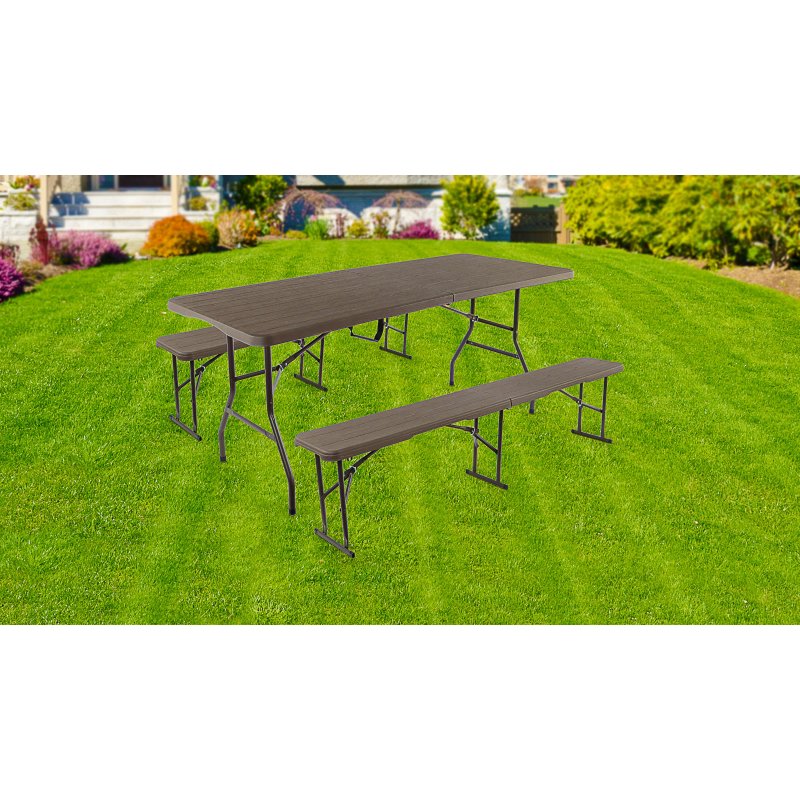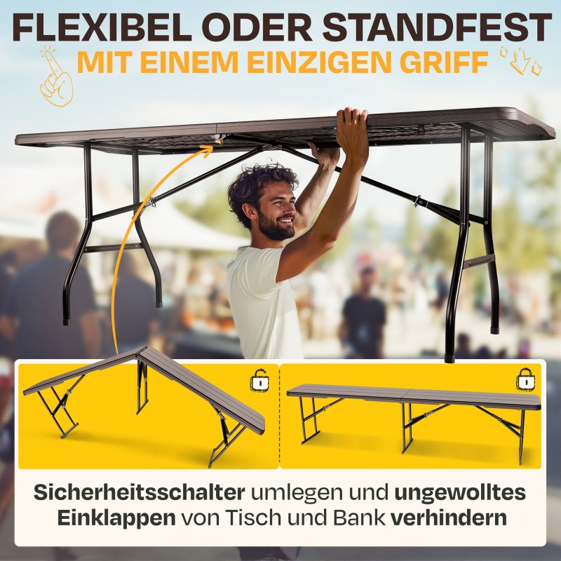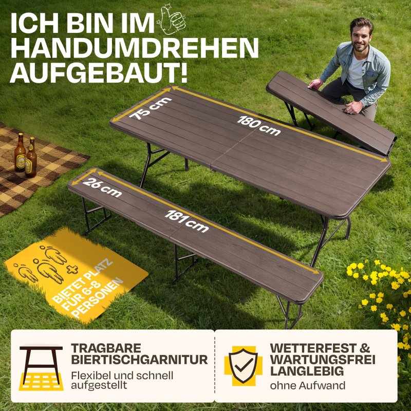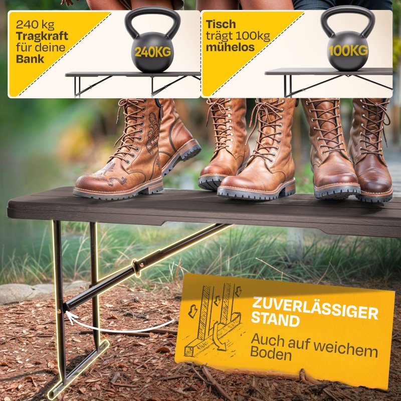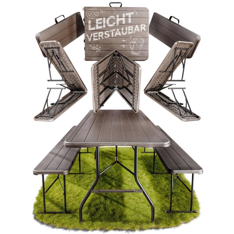 Festivāla telšu komplekts, alus telšu komplekts, piknika komplekts, salokāms, sver tikai 26,5 kg, liels galds un divi soliņi, galds 180 x 75 x 73 (H) cm, sols 181 x 26 x 45 (A) cm, salocītā veidā tikai 10 cm biezs! Ar rokturi ērtai pārnēsāšanai!