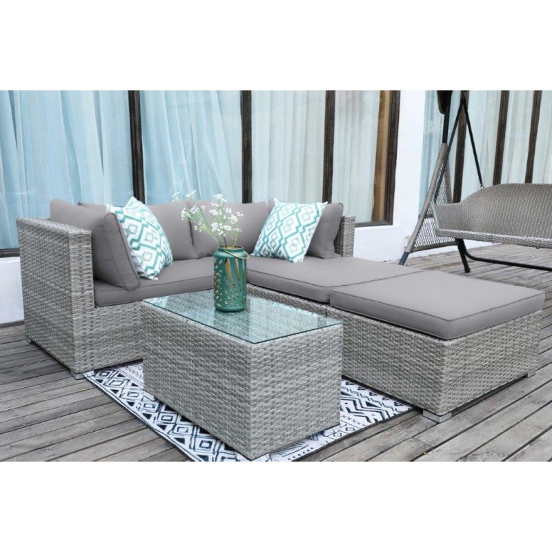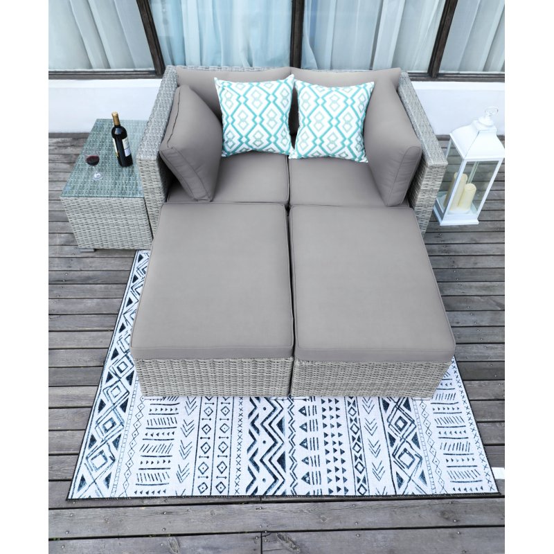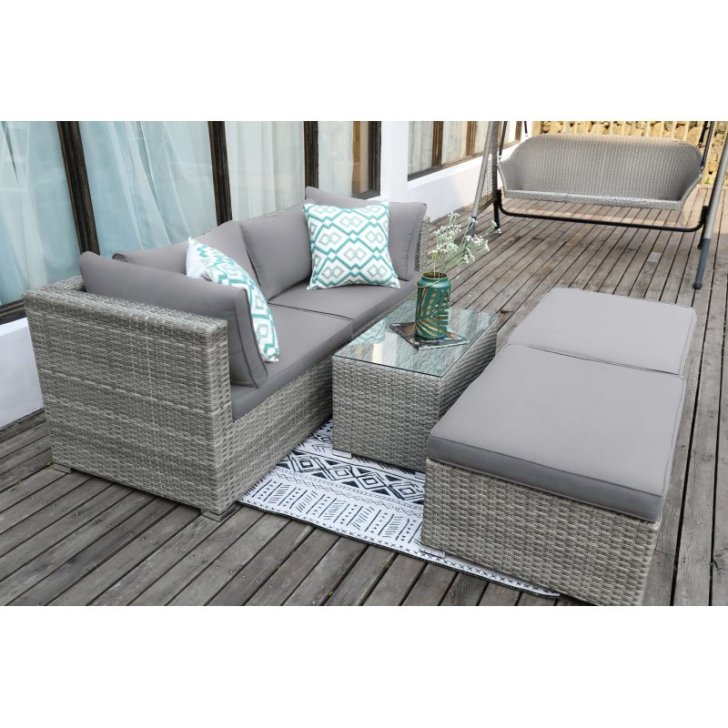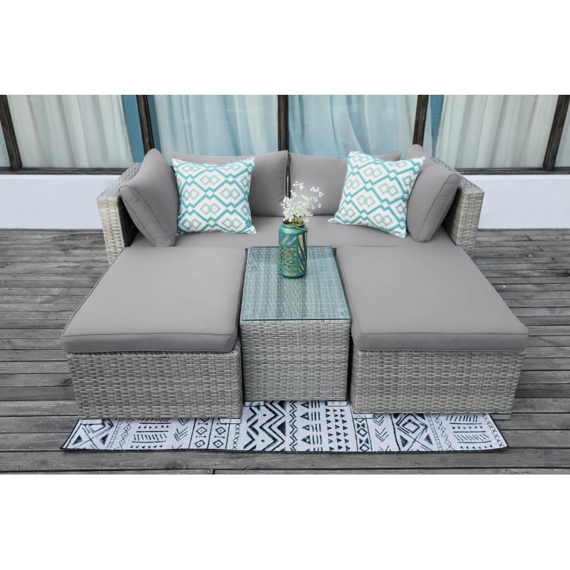 Sonora atpūtas komplekts ar 5 sēdvietām un galdu, var salikt dažādos veidos, modernā rotangpalmas groza izskatā, izturīgs, UV un laikapstākļu izturīgs, polipropilēns, ieskaitot spilvenus, apm. 46 kg