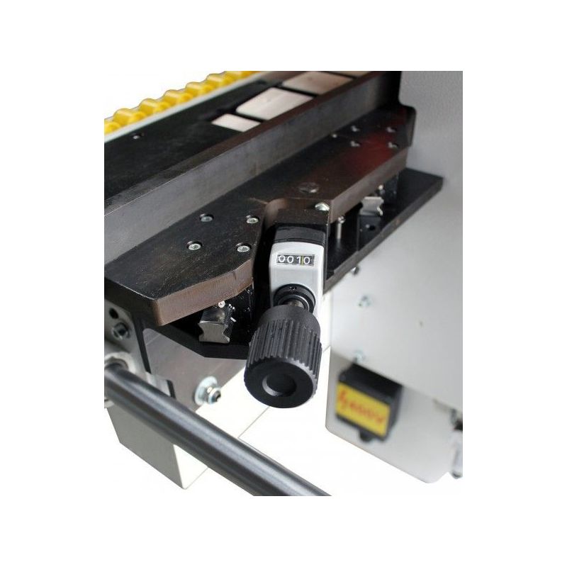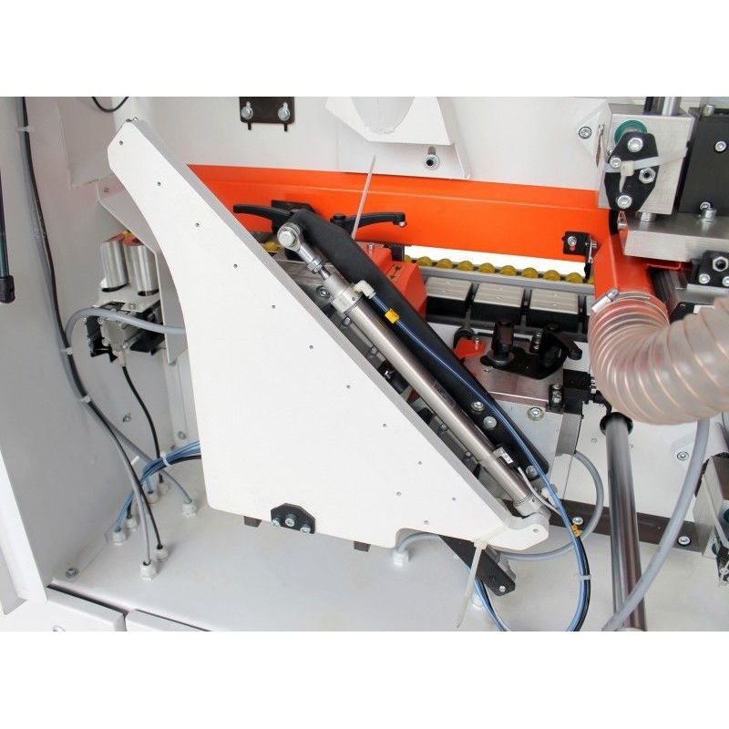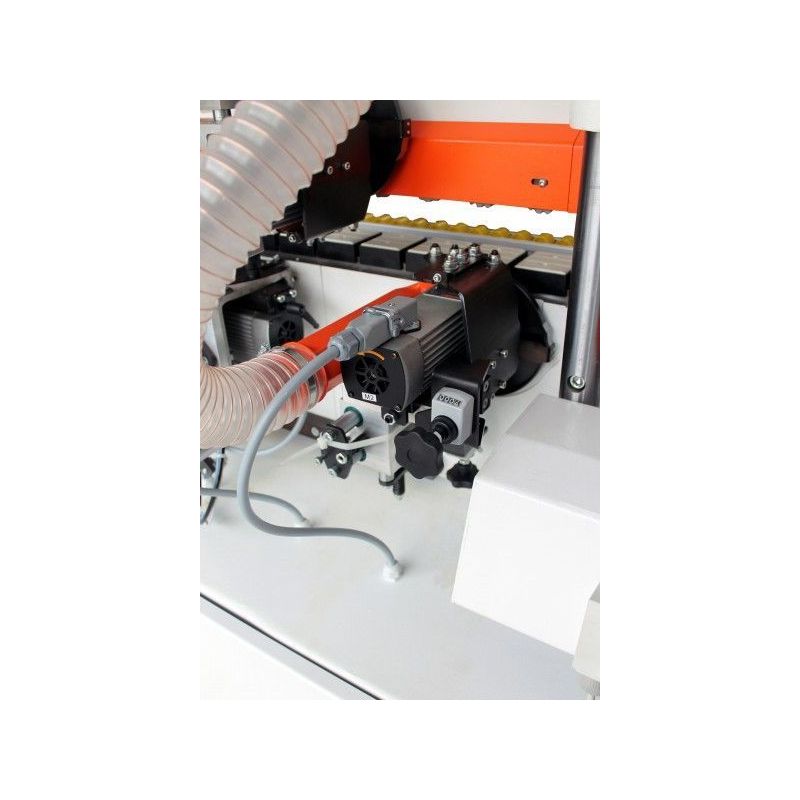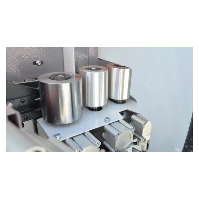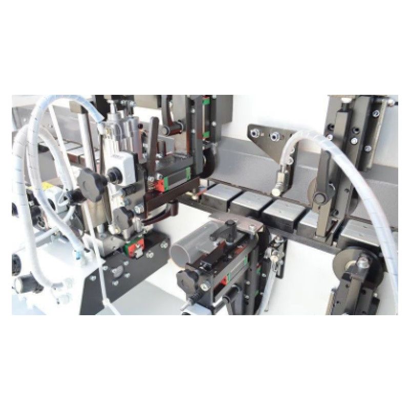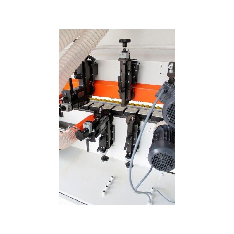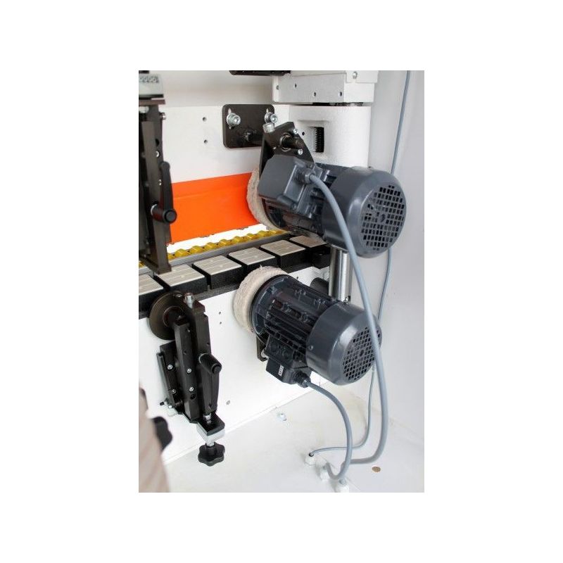 - Augšējais un apakšējais frēzēšanas bloks ar vertikālu un horizontālu regulēšanu uz diviem motoriem (uzstādīti uz lineāriem gultņiem) HF 200 Hz, 12 000 apgr./min un frēzēšanas galviņām 75, Z=4; 15, R2 vai R3 mm (pēc izvēles).