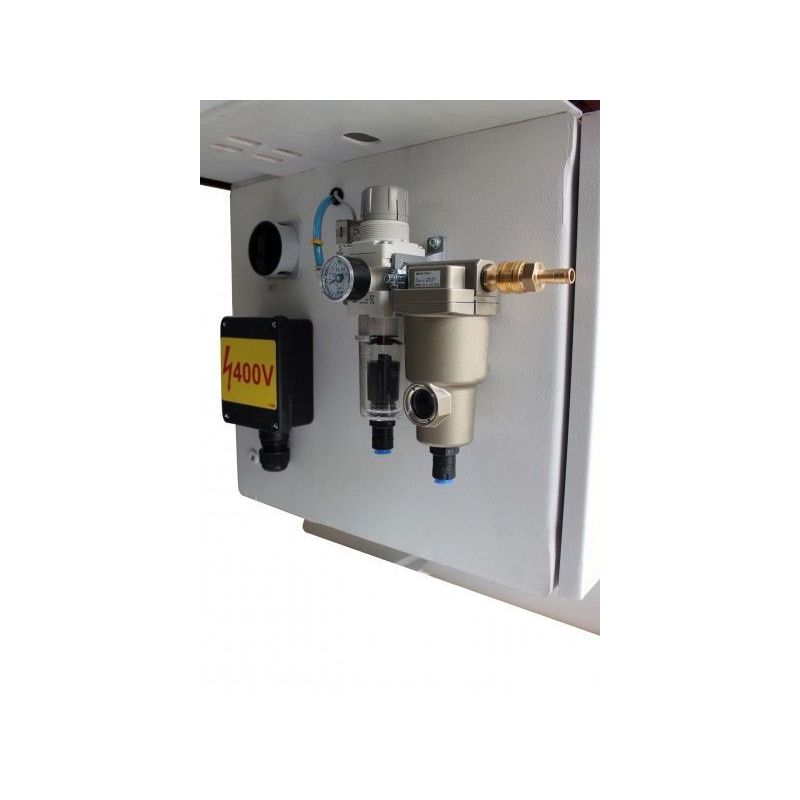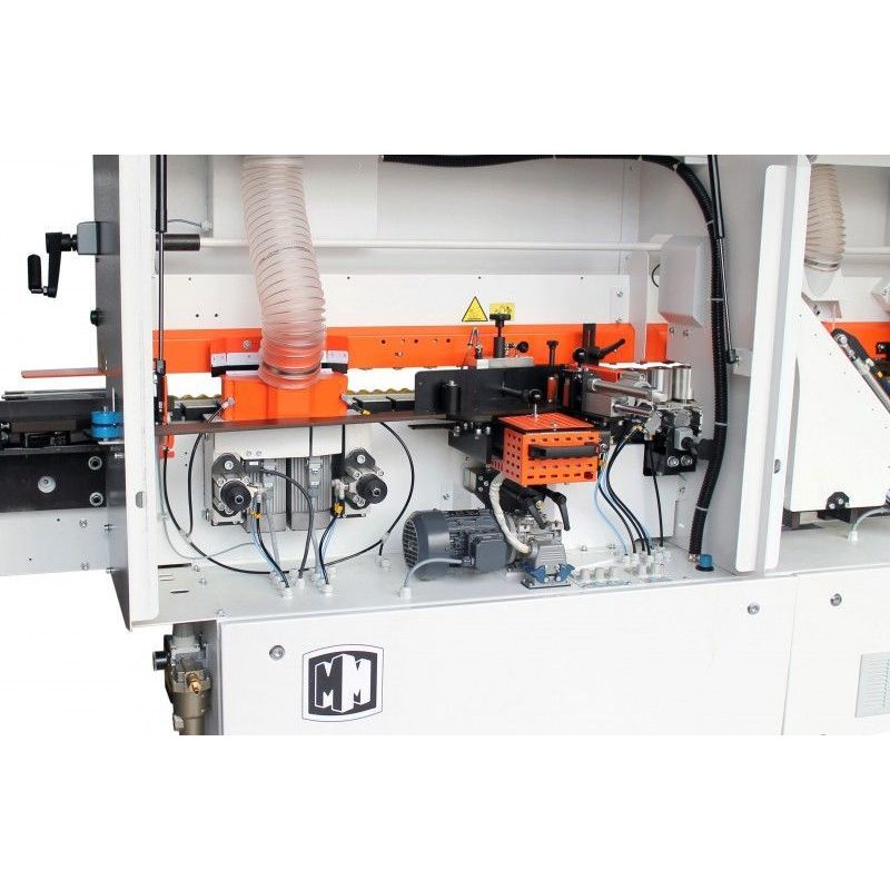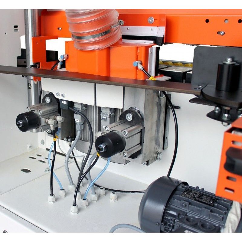 - Augšējais un apakšējais frēzēšanas bloks ar vertikālu un horizontālu regulēšanu uz diviem motoriem (uzstādīti uz lineāriem gultņiem) HF 200 Hz, 12 000 apgr./min un frēzēšanas galviņām 75, Z=4; 15, R2 vai R3 mm (pēc izvēles).