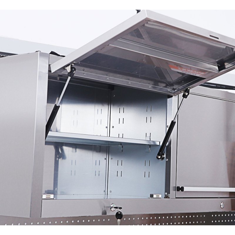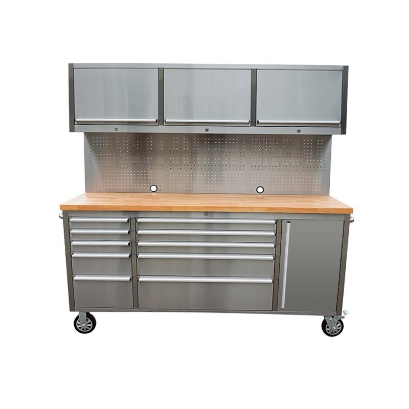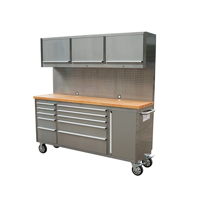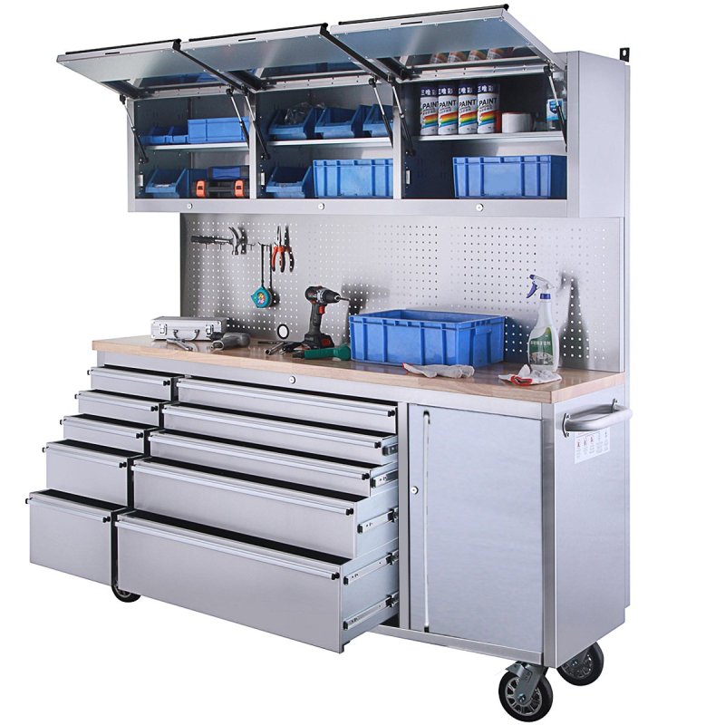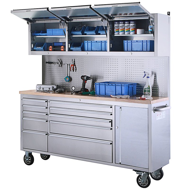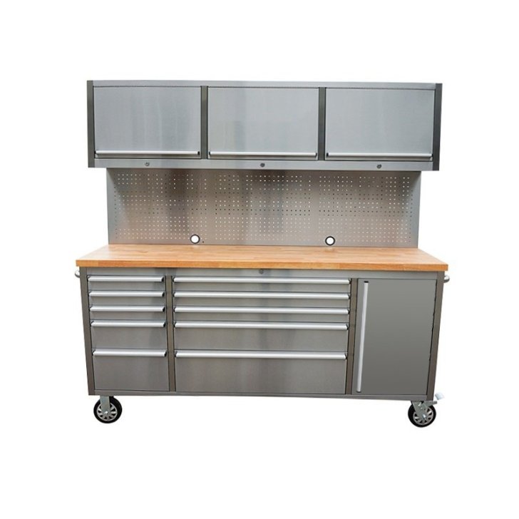 Atklājiet labāko risinājumu savas darbnīcas organizēšanai ar mūsu ekskluzīvajiem instrumentu ratiņiem! Izmēri 183 cm (platums) x 46 cm (dziļums) x 187 cm (augstums) (izmēri bez rokturiem) piedāvā plašu uzglabāšanas vietu un ļauj efektīvi izmantot jūsu darba vietu. Apdare pret pirkstu nospiedumiem ne tikai piešķir augstas kvalitātes estētiku, bet arī nodrošina nevainojamu izskatu pat aizņemtā darbnīcas vidē. 10 atvilktnes un aizslēdzamais īpaši lielais nodalījums piedāvā pietiekami daudz vietas visu veidu instrumentiem un ir aprīkoti ar izturīgiem alumīnija atvilktņu rokturiem, kas ir ne tikai izturīgi, bet arī ērti turami. 35 mm biezā gumijkoka darba virsma augšpusē piedāvā izturīgu, bet elastīgu darba virsmu, uz kuras jūs varat bez piepūles pabeigt savus projektus. Ar atvilktnes pagarinājumu 45 kg atvilktnes var viegli noturēt smagus instrumentus un piederumus. Nerūsējošā tērauda perforētais dēlis nodrošina praktisku instrumentu glabāšanu un ērtu piekļuvi bieži izmantotajiem priekšmetiem. Turklāt trīs sienas skapīši nodrošina papildu uzglabāšanas vietu un organizatorisku daudzpusību. Abi sānu rokturi nodrošina ērtu lietošanu un mobilitāti, savukārt 4x6 collu riteņi, no kuriem divi ir aprīkoti ar bremzēm, nodrošina elastīgu kustību un drošu stabilitāti. Komplektā ietilpst atvilktnes ieliktnis un plakana atslēga, lai jūs varētu sākt darbu nekavējoties. Izbaudiet nepārspējamu organizētību un efektivitāti savā darbnīcā – pasūtiet instrumentu ratiņus jau šodien!