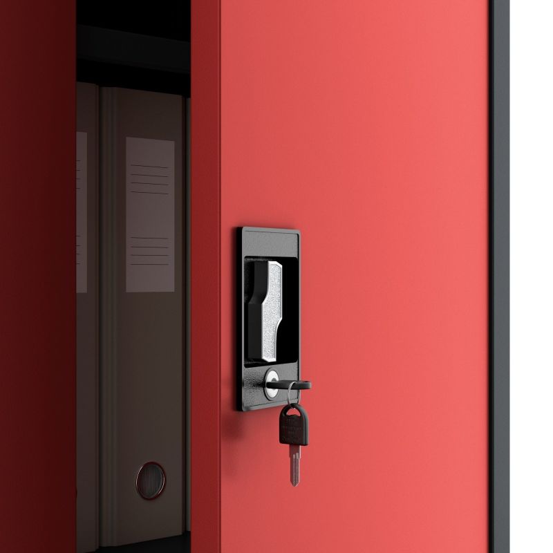 - Aizslēdzams ar atslēgu - 3 punktu slēdzama atslēga sargā glabātos priekšmetus (skapim pievienoti divi atslēgas).
