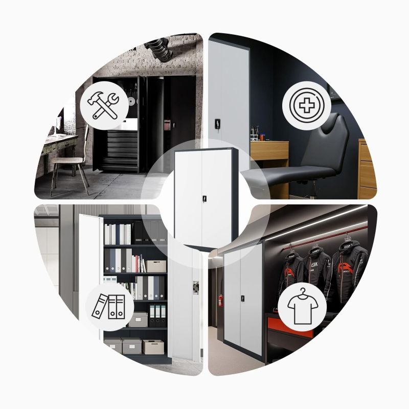 brīvi izmantojiet skapi, pateicoties tā izturīgajai konstrukcijai (0,6 mm biezs tērauds, izturīgs pret mehāniskiem bojājumiem, pulverkrāsots)