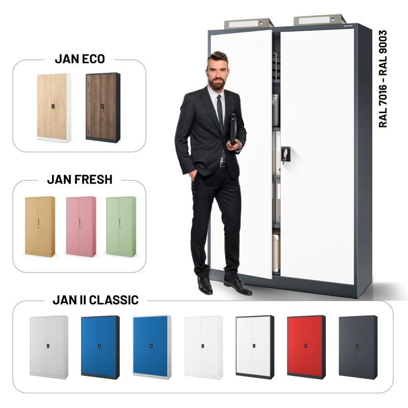 Slēdzams skapis JAN II – neaizstājams dokumentiem, bet ne tikai tiem. Pateicoties izmēram un pilnai plauktu regulēšanai, tas ir lieliski piemērots lielāku priekšmetu, tostarp medicīnas iekārtu un dažādu veidu instrumentu, glabāšanai. Nekas neliedz to izmantot arī mājās – tas lieliski iederas industriālā vai minimālisma interjerā!
