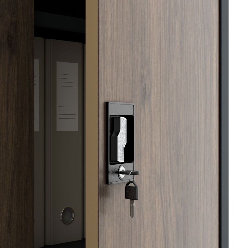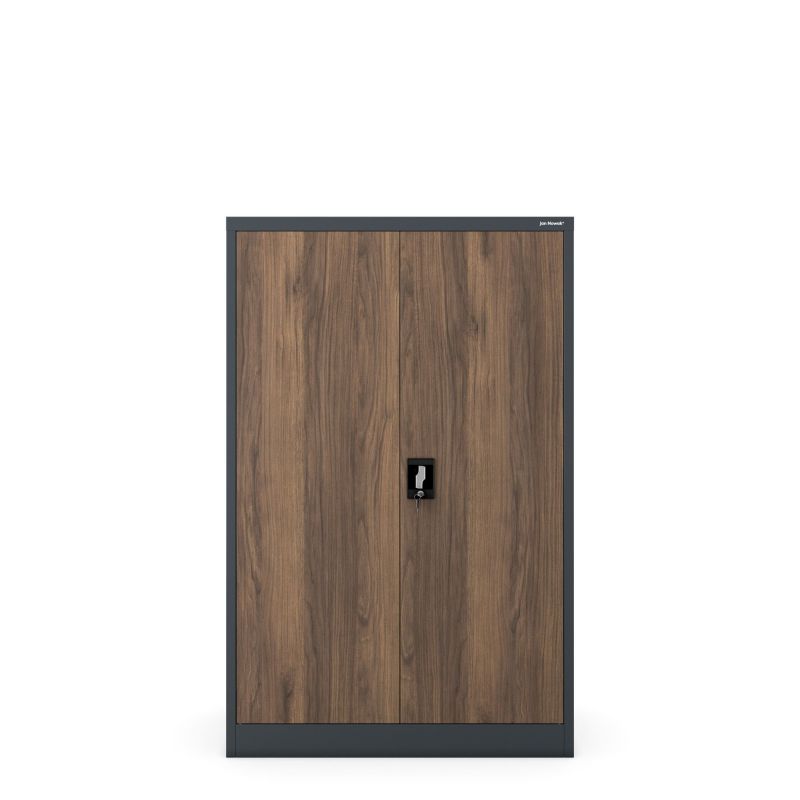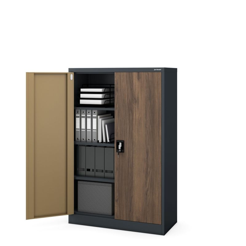 Mēs rūpējamies par vidi, un tieši daba mūs iedvesmo, lai radītu un paplašinātu Eco Design sēriju. Tas apvieno metāla mēbeļu izturību un ilgmūžību ar koka eleganci. Kevina durvis ir pārklātas ar nodilumizturīgu, videi draudzīgu krāsu, kas atgādina valrieksta koka krāsu. Pateicoties tam, mūsu biroja skapis joprojām ir izturīgs un izturīgs pret bojājumiem, taču izskatās smalks un elegants.
