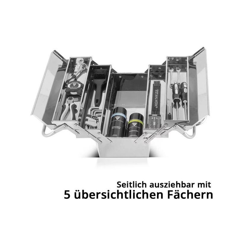 Kopumā pieci nodalījumi nodrošina optimālu organizāciju un kārtību. Instrumentu kasti var izvilkt uz sāniem un atkal salocīt, lai ietaupītu vietu.