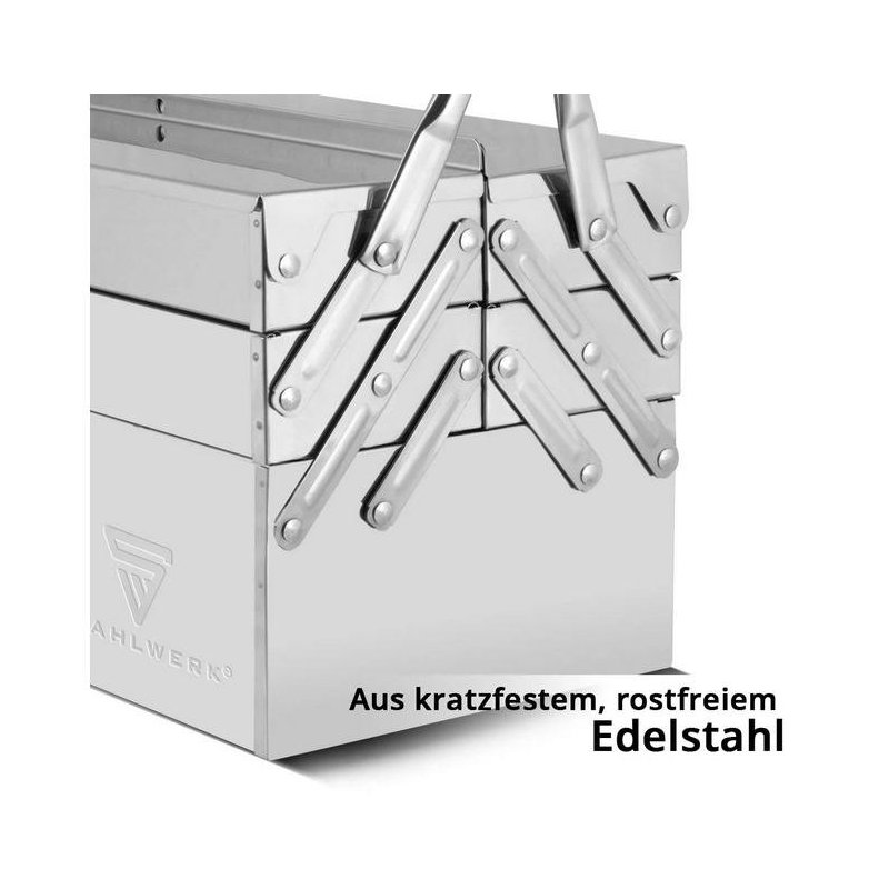 STAHLWERK nerūsējošā tērauda instrumentu kaste pārsteidz ar savu vienkāršo dizainu, ērto, vietu taupošo transportēšanu un pārskatāmo instrumentu organizāciju.