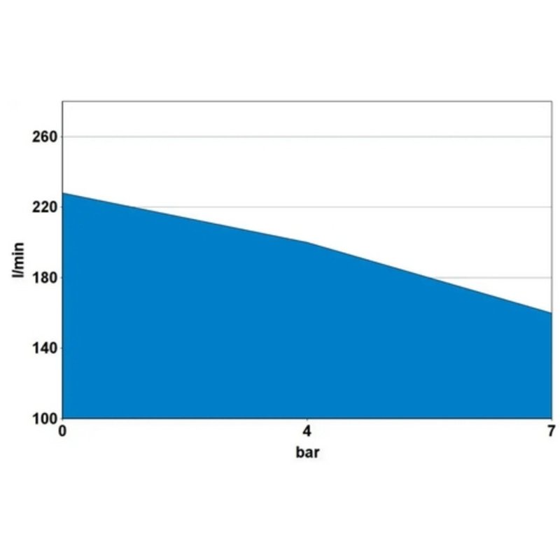 Efektīvā padeves jauda pie 4 bar: 200 l/min Piegādes ātrums pie 7 bar: 160 l/min