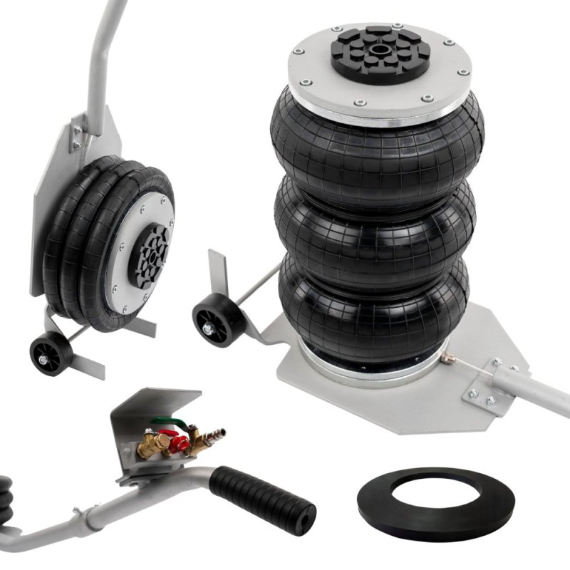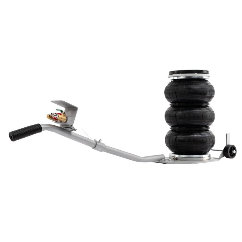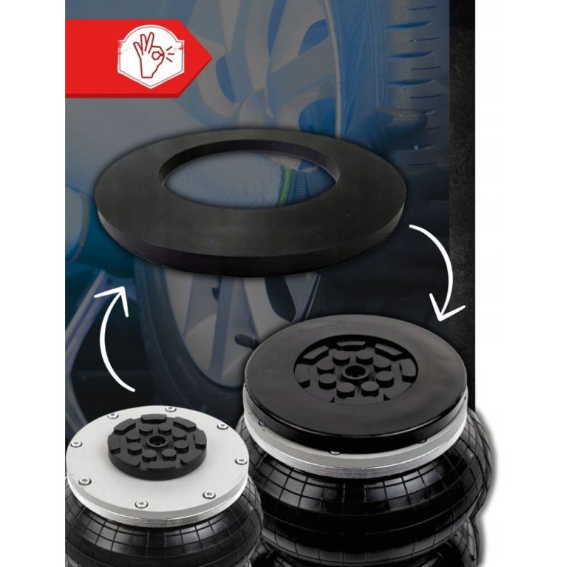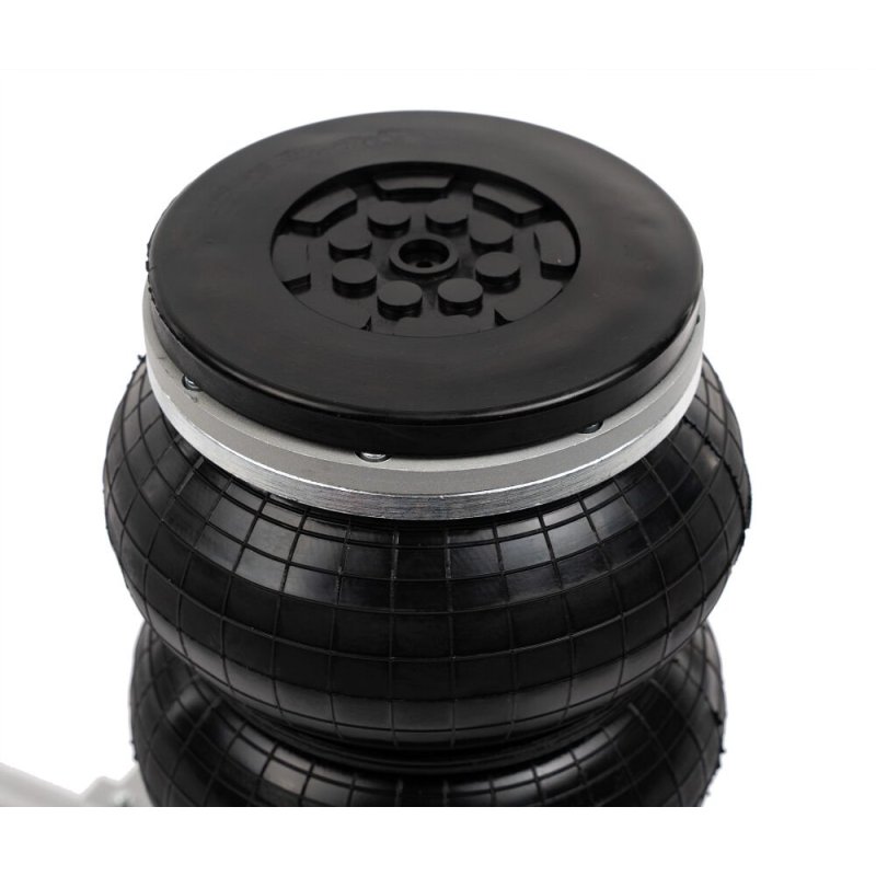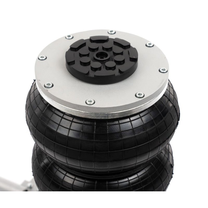 Pneimatiskais domkrats ar gaisa spilvenu ir profesionāls aprīkojums, ko var veiksmīgi izmantot riepu darbnīcās, autoservisos un fermās. Šim sniegavīra domkratam ir pastiprināta konstrukcija ar izturīgākiem virzuļiem, kas spēj pacelt transportlīdzekļus, kuru svars ir līdz 3,5 tonnām, vienā punktā. Gaisa spilvenā ir iestrādāts augstas kvalitātes iekšējais teleskops, kas nodrošina stabilitāti pat pie maksimālas slodzes. Komplektā ir iekļauts bezmaksas gumijas gredzens, lai aizsargātu sliekšņus un citas nesošās detaļas no skrāpējumiem vai bojājumiem. Gumijas gredzens nodrošina drošu pacelšanu un atvieglo domkrata novietošanu pareizajā vietā, ievērojami paātrinot un vienkāršojot darbu. Domkrats darbojas ar saspiestu gaisu ar darba spiedienu no 5 līdz 10 bar. Priekšrocības: