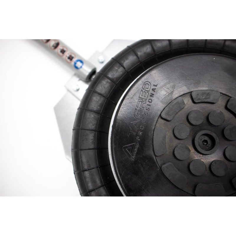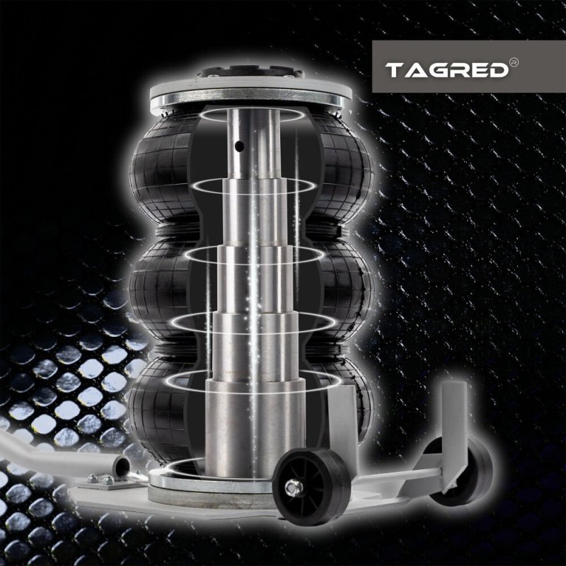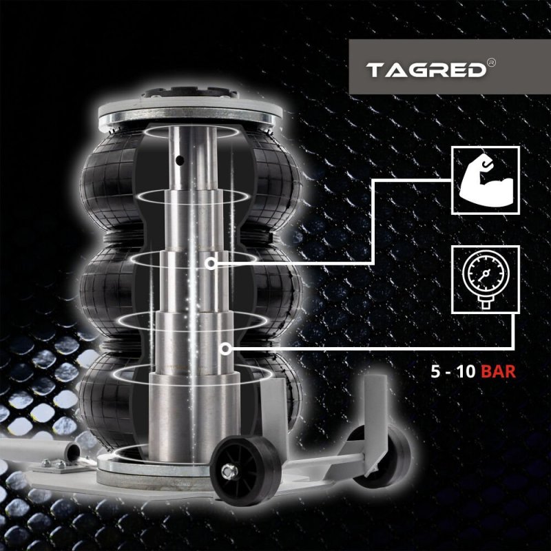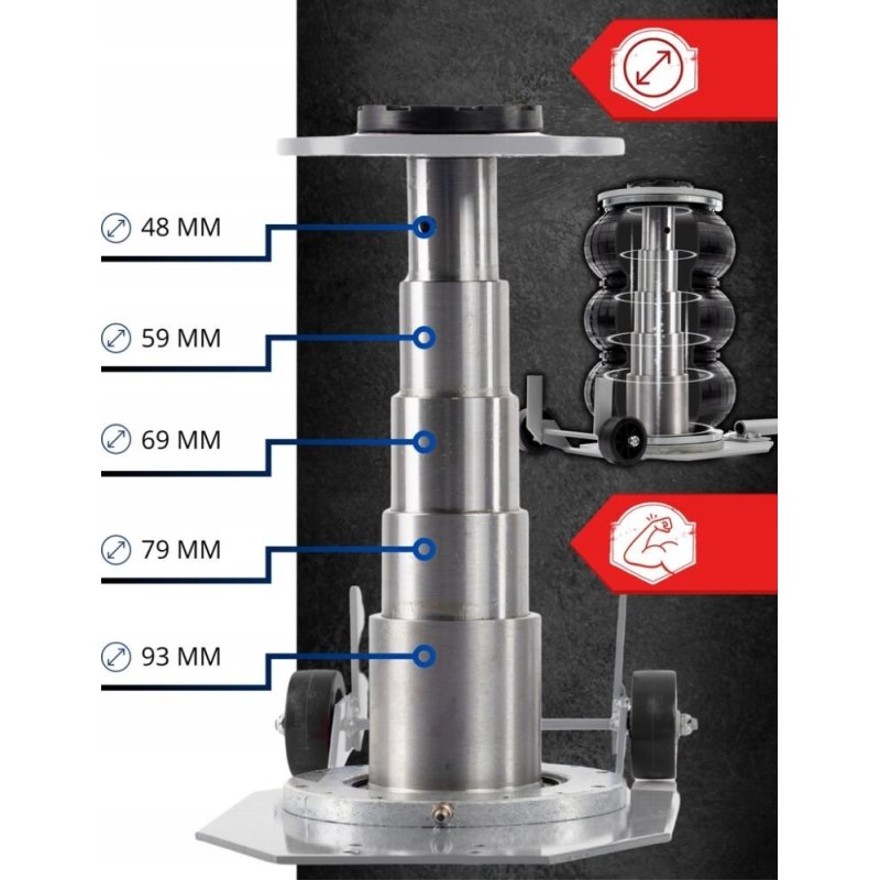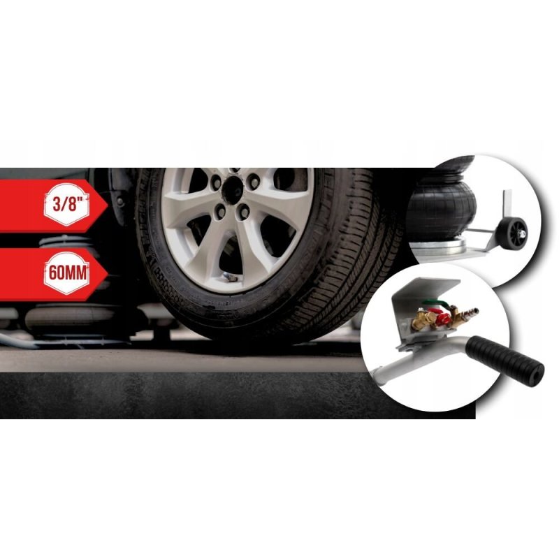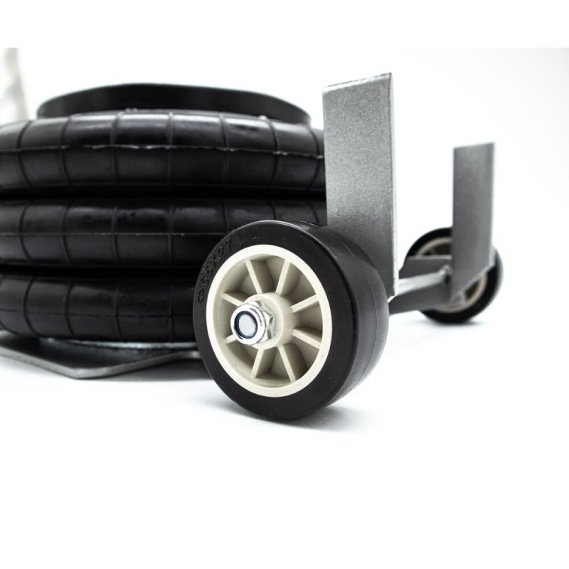 Pneimatiskais domkrats ar gaisa spilvenu ir profesionāls aprīkojums, ko var veiksmīgi izmantot riepu darbnīcās, autoservisos un fermās. Šim sniegavīra domkratam ir pastiprināta konstrukcija ar izturīgākiem virzuļiem, kas spēj pacelt transportlīdzekļus, kuru svars ir līdz 3,5 tonnām, vienā punktā. Gaisa spilvenā ir iestrādāts augstas kvalitātes iekšējais teleskops, kas nodrošina stabilitāti pat pie maksimālas slodzes. Komplektā ir iekļauts bezmaksas gumijas gredzens, lai aizsargātu sliekšņus un citas nesošās detaļas no skrāpējumiem vai bojājumiem. Gumijas gredzens nodrošina drošu pacelšanu un atvieglo domkrata novietošanu pareizajā vietā, ievērojami paātrinot un vienkāršojot darbu. Domkrats darbojas ar saspiestu gaisu ar darba spiedienu no 5 līdz 10 bar. Priekšrocības: