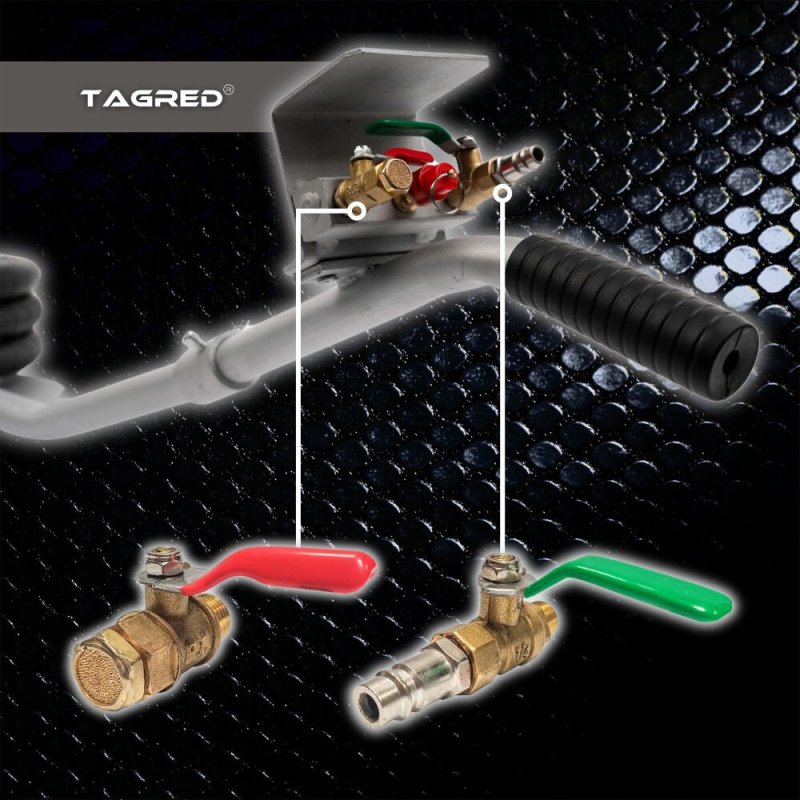 3/8” lodveida vārsti ar ērtām krāsu kodētām svirām: padeve - zaļa, iztukšošana - sarkana,