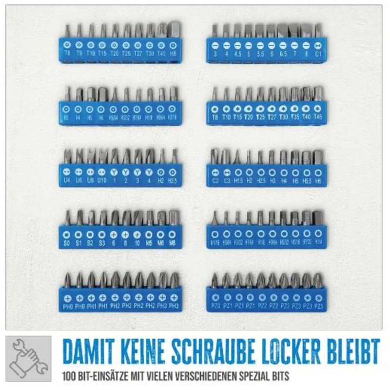 - 100 dažādi uzgaļi (biti) 6,3 mm (1/4"), šķiroti