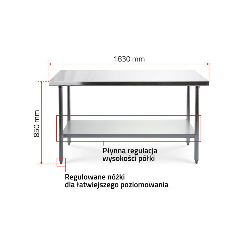 Darba galds: virtuves, gastronomijas, ēdināšanas, laboratorijas, darbnīcas. Galds ir aprīkots ar spēcīgām kājām, kas nodrošina visas konstrukcijas stabilitāti. Visa konstrukcija ir pastiprināta ar auksti liektiem profiliem, kas garantē darba virsmas stingrību. Produkts ir ražots saskaņā ar ES standartiem, tam ir SANEPID sertifikāts un tas ir apstiprināts saskarei ar pārtiku.