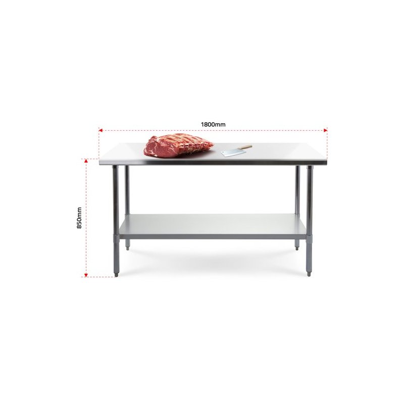 Gastronomijas gaļas sadalīšanas/miesnieka darba galds, nerūsējošā, skābju izturīga INOX darba virsma. Darba kārta: polietilēns – ideāli piemērots griešanai, kapāšanai utt. Produkts ražots saskaņā ar ES standartiem, ar SANEPID sertifikātu, apstiprināts saskarei ar pārtiku.