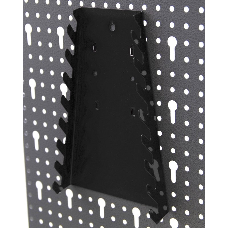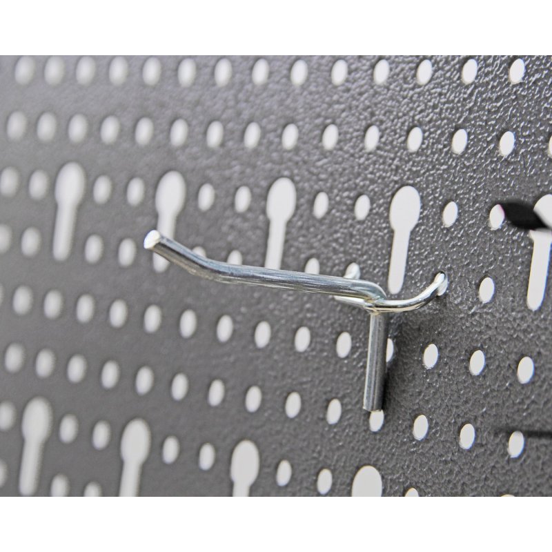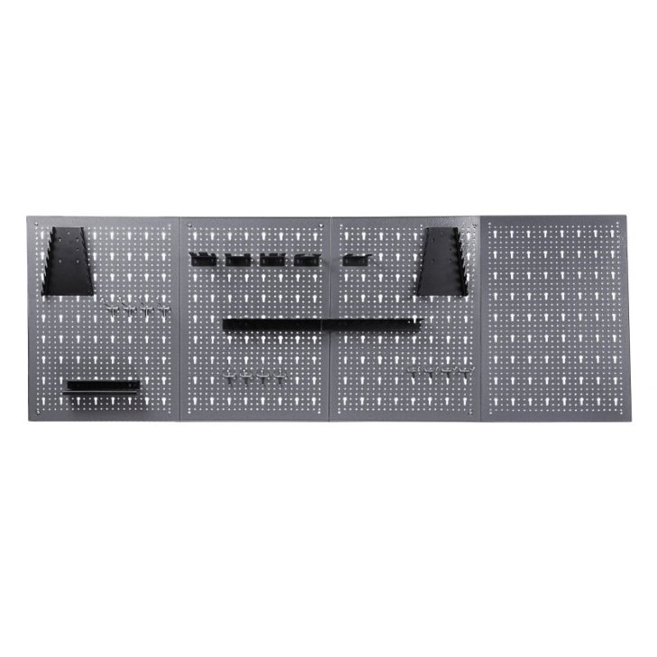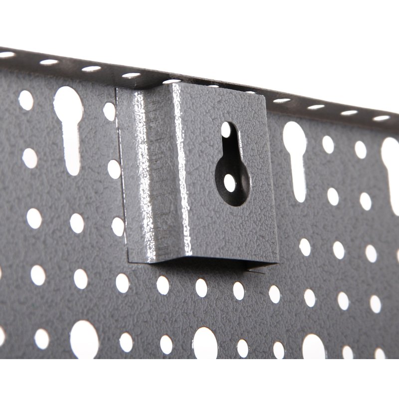 Perforētais dēlis, kura izmēri ir aptuveni 162 x 1 x 59 cm (augstums), ir izgatavots no metāla un sver aptuveni 4,5 kg. Tas piedāvā daudz vietas, piemēram, mūsu 22 daļu āķu komplektam. Tas sastāv no četrām sekcijām (katra aptuveni 40 x 57 cm), kuras var arī atsevišķi piestiprināt pie sienas. Tas ļauj elastīgi iekārtot savu darbnīcu atbilstoši jūsu vajadzībām. Atsevišķos perforētos dēļus var pieskrūvēt pie sienas. Katrai perforētā dēļa sekcijai aizmugurē ir arī cilpiņa pakarināšanai. Vienkāršā pelēkā krāsa ir mūžīga un iederas jebkur.