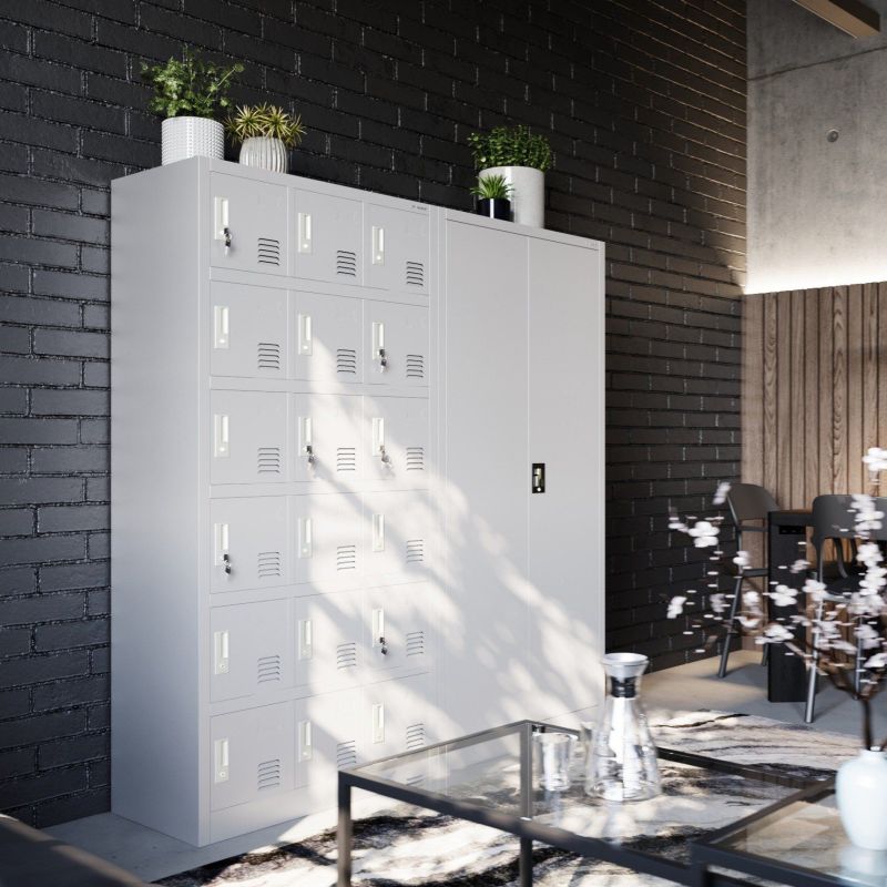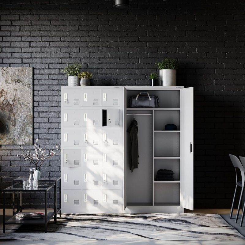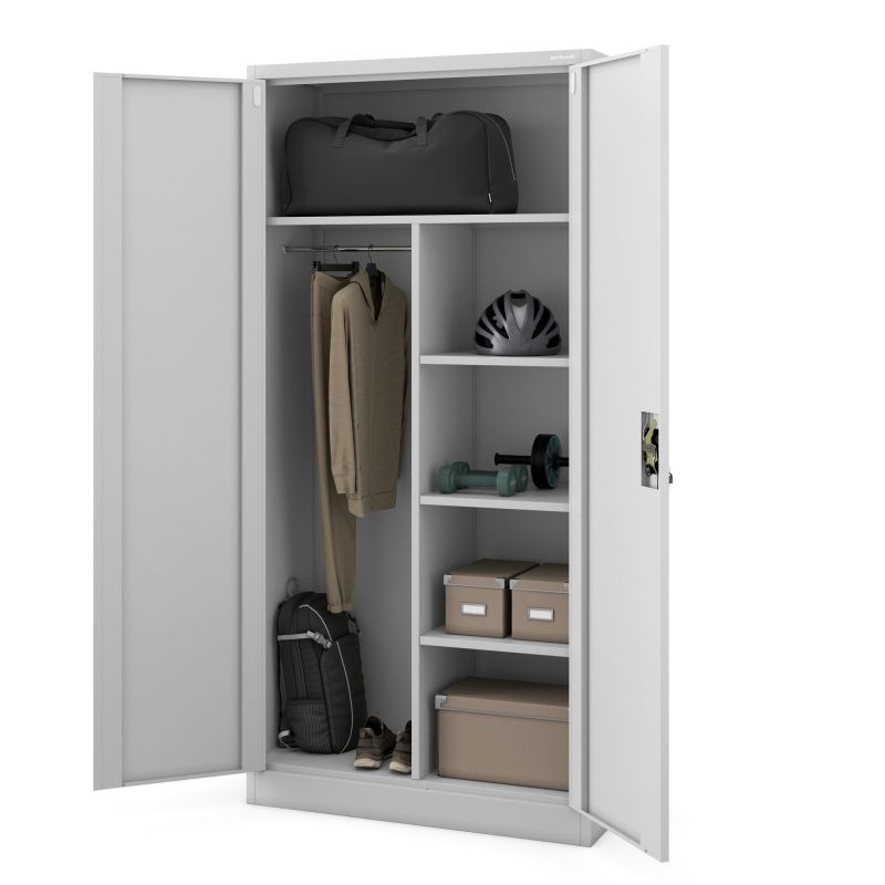 Apģērbu skapis ar plauktiem DAWID lieliski noder neatkarīgi no telpas veida un apstākļiem. Tā ražošanā mēs izmantojām augstas kvalitātes 0,6 mm biezu tēraudu un pārklājām to ar pulverkrāsu. Rezultātā ir izveidots pret rūsēšanu un mehāniskiem bojājumiem izturīgs, viegli kopjams metāla skapis, kas pārsteidz ar funkcionalitāti un estētisko izpildījumu.