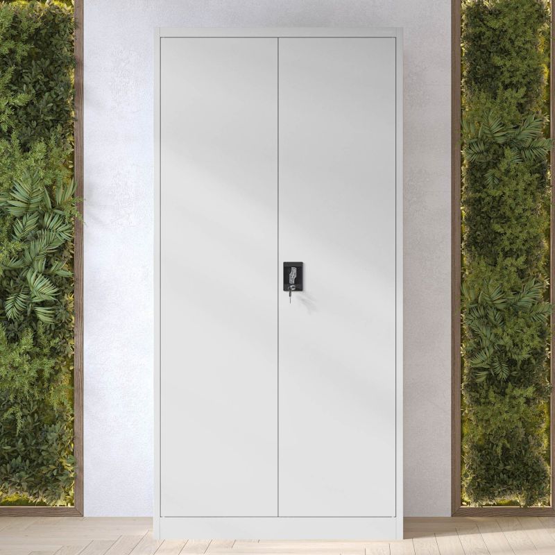 Pelēka metāla skapis ar plauktiem ir labākā izvēle. Uz virsmas parādījušies netīrumi būs praktiski neredzami un ļoti ātri noņemami ar mitru drānu un nedaudz mazgāšanas līdzekli. Turklāt tas ir piemērots gan saimniecības telpām, darbnīcai, ģērbtuvei, gan birojam, ārsta kabinetam. 90 cm platums ļauj izmantot DAWID modeli pat vismazākajā telpā.