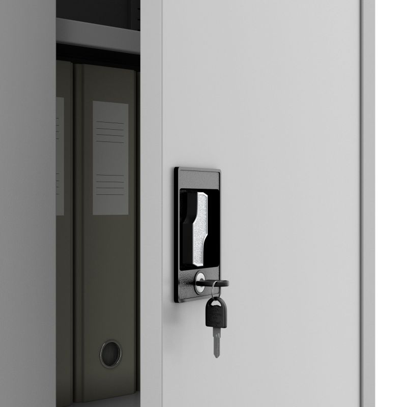 Skapis ar divviru durvīm ir aizslēdzams ar atslēgu. Aizslēdzamais slēdzene aizsargā saturu no nepiederošu personu piekļuves. Metāla skapis ar plauktiem DAWID ļauj profesionāli uzglabāt nepieciešamos priekšmetus vai dokumentus – saskaņā ar spēkā esošajām GDPR prasībām.