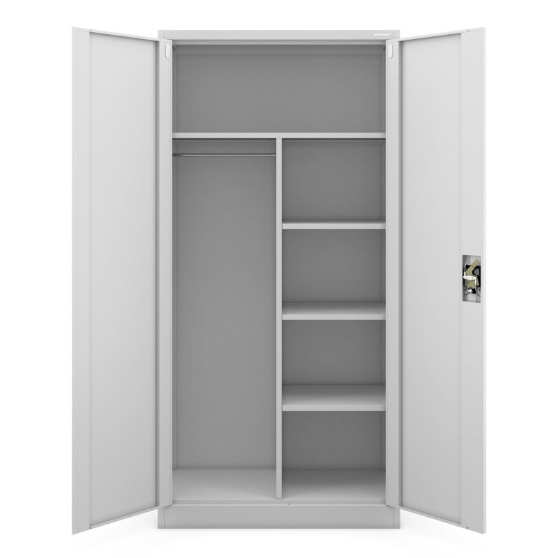 Metāla skapis ar plauktiem DAWID ir risinājums, ar kura palīdzību viegli sakārtosiet telpu birojā, darbnīcā, medicīnas iestādē vai garāžā. Tam ir trīs praktiskas zonas: plaša daļa ar plauktiem, augsta kamera ar drēbju pakaramu un plata augšējā plaukts. Katram priekšmetam metāla skapī DAWID būs sava vieta, un jūs reizi par visām reizēm aizmirsīsiet par nekārtību un pazaudētajām lietām.