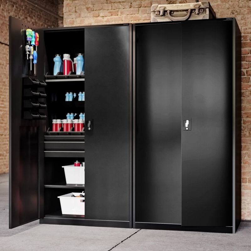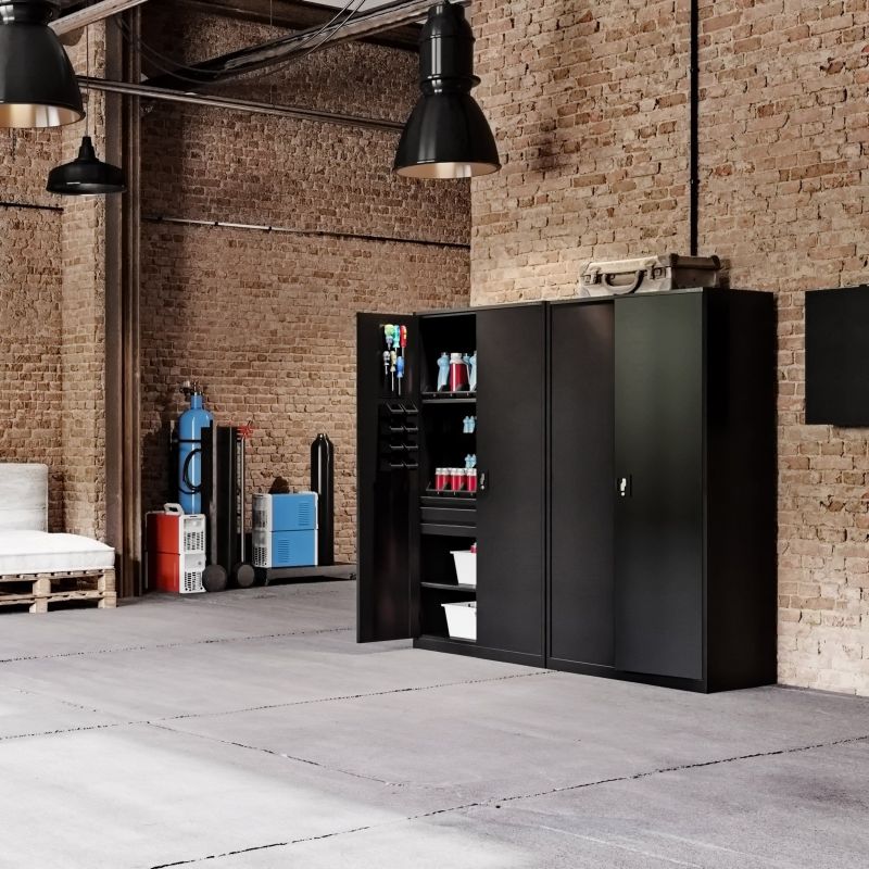 SZYMON instrumentu skapim no All Black kolekcijas ir daudz priekšrocību, taču lietojamība noteikti ir tā stiprā puse. Tērauda mēbeļu interjeru sadalījām trīs zonās. Apakšējā ar plauktu, vidējā ar 2 atvilktnēm un lielākā, augšējā ar plauktu un instrumentu dēļiem. Šis izkārtojums sniedz jums daudz vietas, lai sakārtotu visus priekšmetus jūsu darbnīcā.