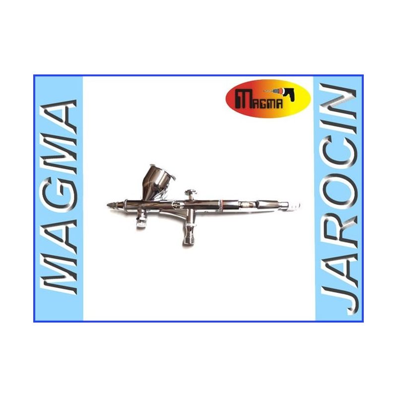 TG-180 ir aizmugurējā poga, ko izmanto adatas gājiena pielāgošanai. To izmanto, piemēram, kad mēs vēlamies krāsot plankumus, kas nav lielāki par norādīto izmēru. Specifikācija: - 0,2 un 0,30 sprauslas - paint krūti type: gravity - double darbība kontrole - garums 16cm - darba spiediens 15-50 PSI - krāsas konteiners ietilpība 9cm3 - Par aereograph ir 1/8 "vītne ieeja, t.i., par 9.42mm produktu ir gravējums uz MAGMA aerosola korpusa. Komplektā ietilpst: