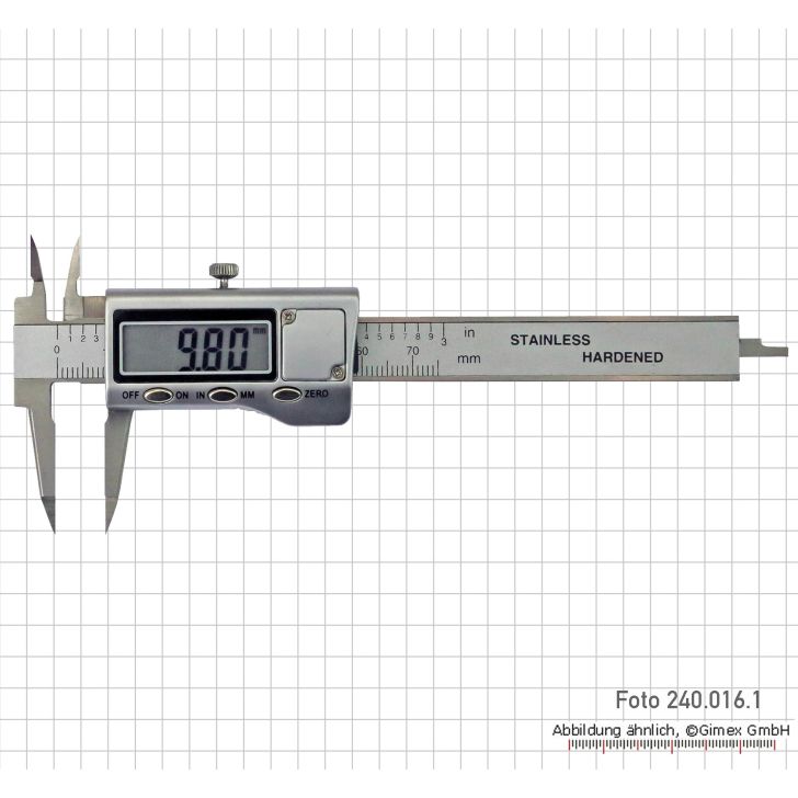 240.016.1 ar šaurām spīlēm un šauriem galiem - izgatavots no nerūsējošā tērauda, rūdīts - ar metāla korpusu - ar ieslēgšanas/izslēgšanas pogu, mm/collas un nulles - displejs 12 mm - rādījums 0,01 mm vai 0,0005" - korpusā
