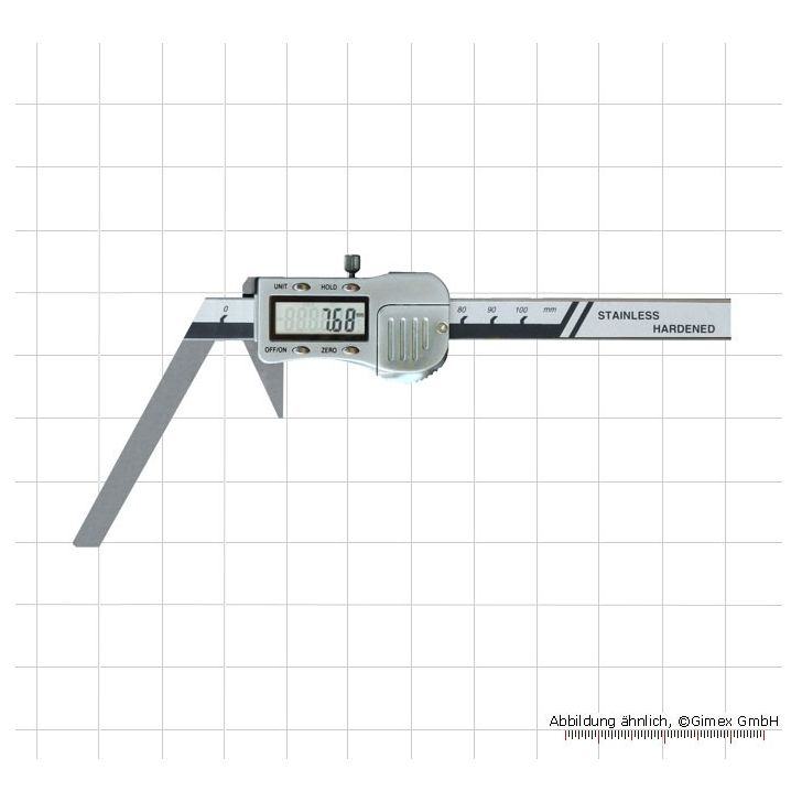 240.146 griešanas urbjmašīnas naža garuma precīzai mērīšanai ar priekšgala leņķi 130° - Mērīšanas sistēma ar 3 V - Elektroniska metāla korpusā - izgatavota no nerūsējošā tērauda, rūdīts - ar ieslēgšanas/izslēgšanas, nulles, mērīšanas un noturēšanas pogām (ar pogu Hold mērījumu vērtību var iegaumēt vēlākai nolasīšanai) - Datu izvade RB 5 - korpusā/kastē