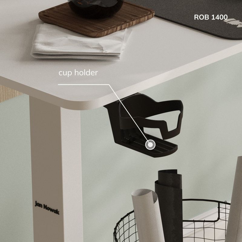 Divās regulējamā galda pusēs ir praktiski turētāji. Vienā no tām jūs pakārt austiņas, bet otra kalpo kā vieta krūzei vai termosam. Pēc tikai lietošanas brīža jūs būsiet pārliecināts par turētāju praktiskumu. Dzēriens, kas ievietots grozā, nekad neizplūst uz tastatūras, un austiņas vienmēr būs gatavas nākamajai tiešsaistes sanāksmei. Sīkrīki ir ļoti funkcionāli, bet arī izturīgi, jo tie ir izgatavoti no pastiprinātas plastmasas. Gadiem ejot, viņi joprojām paveiks lielisku darbu.