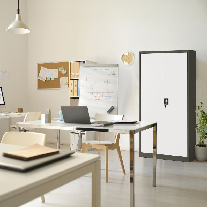 Antracīta un balto Jan H metāla skapi raksturo izturība un uzticamība. Paldies brīvi regulējamiem plauktiem, jūs iegūsit nepieciešamo glabāšanas vietu. Mūsu metāla skapī ir spraugas aizmugurē un sānu sienās, kas ļauj to piestiprināt pie sienas. Tas palielinās ikdienas lietošanas drošību. Sloti skapja augšējā daļā ļauj piestiprināt augšējo vienību.