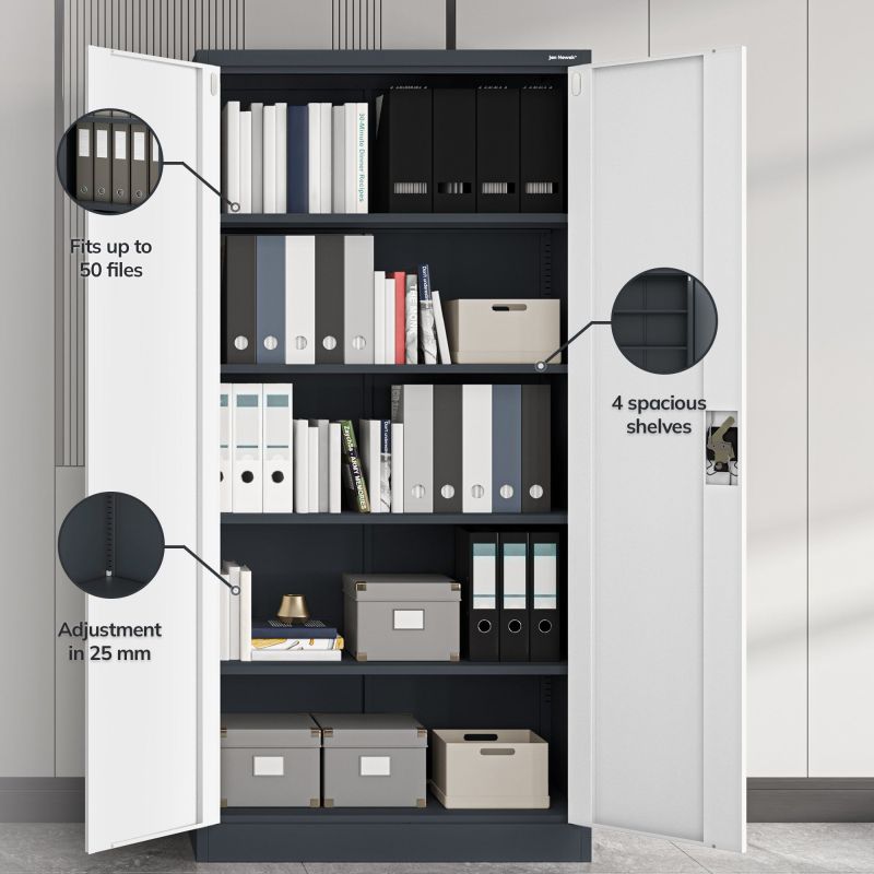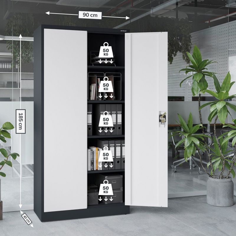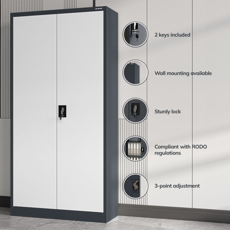 Jan faila skapī ir ārkārtīgi pievilcīga antracīta un balta krāsa. Pateicoties regulējamajiem plauktiem, jūs iegūsit tieši nepieciešamo vietu.