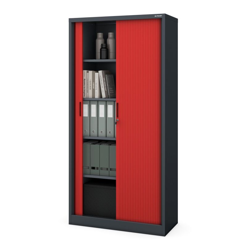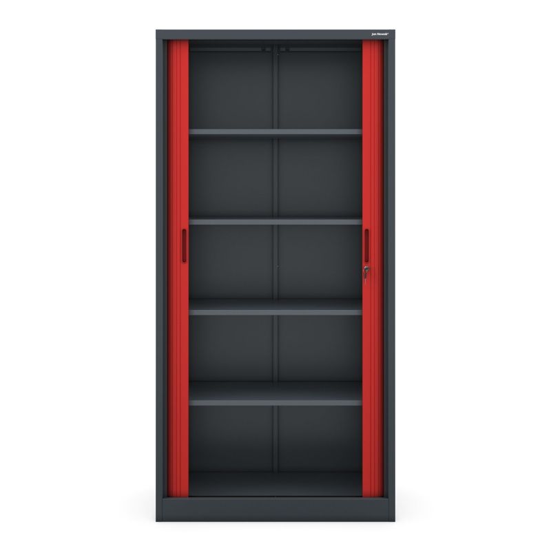 Antracīta sarkans skapis JAN NOWAK modelis DAMIAN – bīdāmās durvis ar rullo žalūzijām, tērauda, universāls