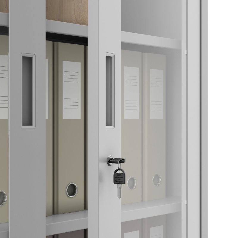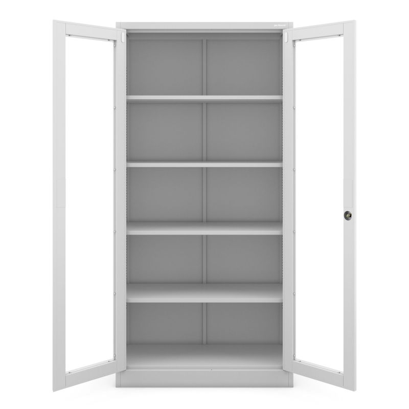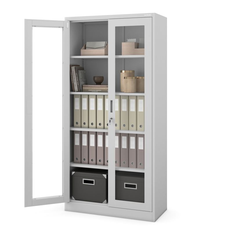 Liela uzglabāšanas zona – skapī ar stikla durvīm var ievietot līdz pat 50 mapēm. Tas ir aprīkots ar 4 plauktiem, kas regulējami ik pēc 25 mm, un katra augstumu var brīvi mainīt. Tādēļ neatkarīgi no uzglabājamo priekšmetu izmēra, vieta atradīsies visam.
