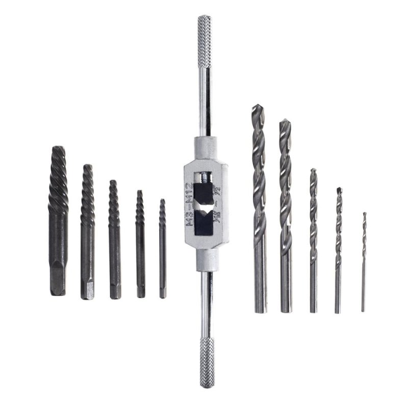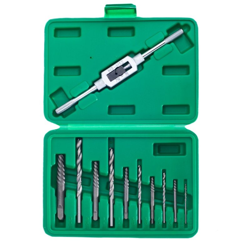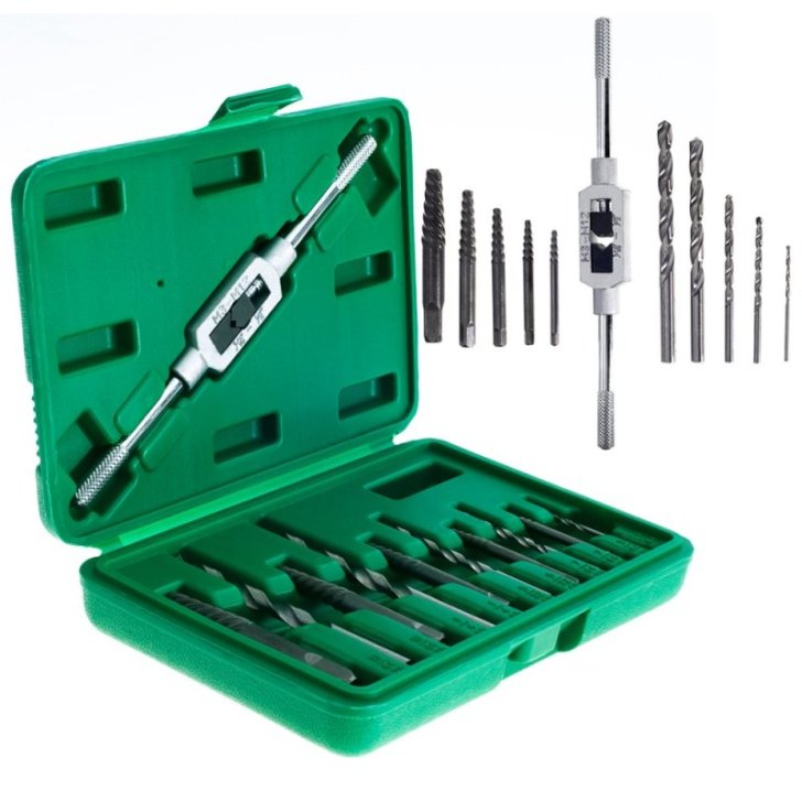 Komplekts skrūvju un tapu izskrūvēšanai bez trieciena instrumentu izmantošanas, ievietots maciņā. Komplektā ietilpst regulējama poga precīzai un efektīvai izskrūvēšanai.