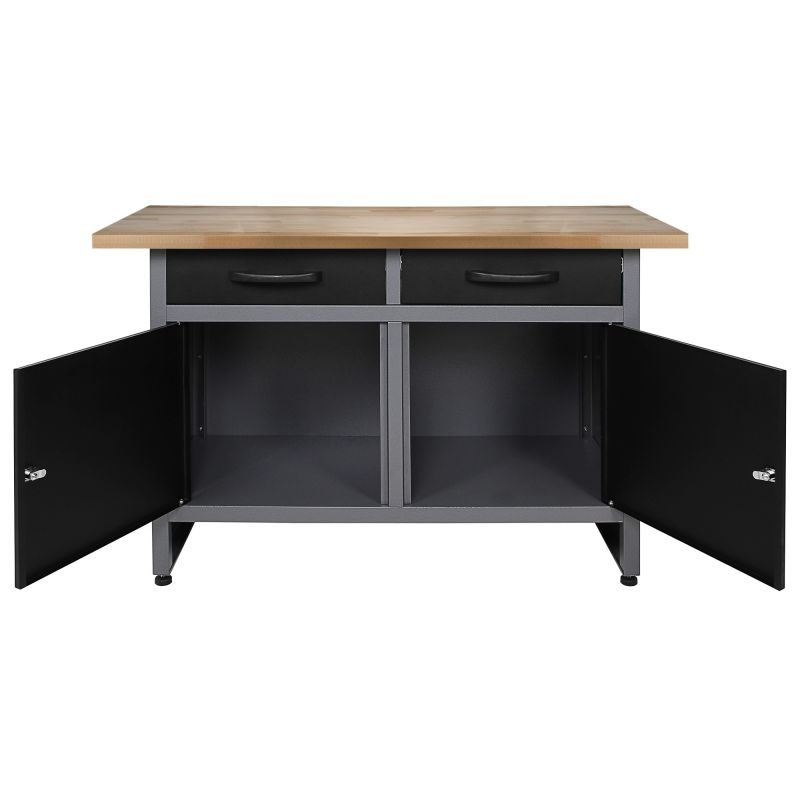 Ar praktisku nišu kā sēdoša darba vieta smalkam darbam - lieliski apgaismota, sēdvietu nišu var izmantot arī darbnīcu ratiņu, atkritumu tvertņu vai ķebļu uzglabāšanai, 3 atvilktnes kā optimāla uzglabāšanas vieta, 3 lieli nodalījumi apjomīgākiem priekšmetiem, slēdzamas durvis, perforētas sienas iekļauti arī slēdzami sienas skapji.