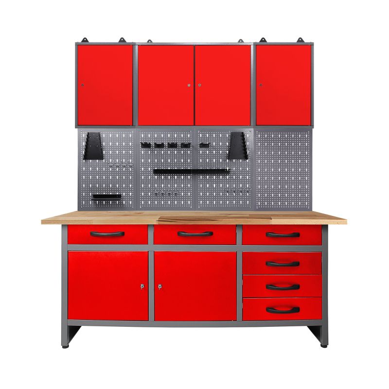 Darbnīcas aprīkojums 160 cm - darba augstums 85 cm - sastāv no 1 x darbagalda (Karsten), 3 x darbnīcas skapja (42 cm / 80 cm), 4 x perforētas sienas, 1 x perforēta sienas āķu komplekta