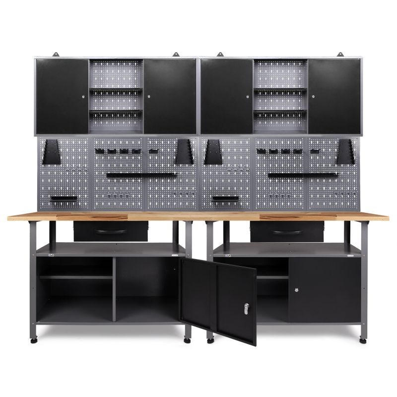 Darbnīcas aprīkojums 240 cm - darba augstums 85 cm - sastāv no 2 x darbagalda (Klaus), 2 x darbnīcas skapja (120 cm), 6 x perforētas sienas, 2 x perforēta sienas āķu komplekta