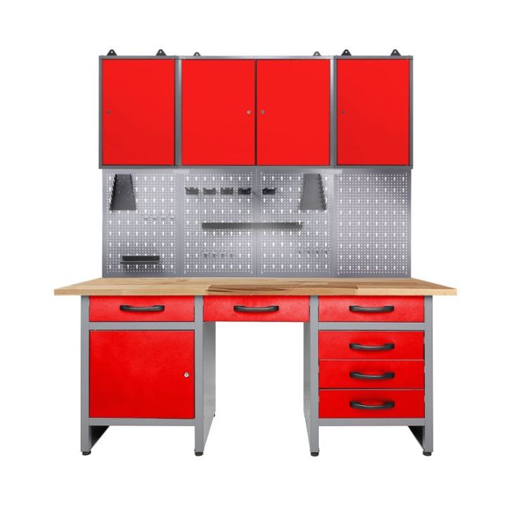 Darbnīcas aprīkojums 160 cm - darba augstums 85 cm - sastāv no 1 x darbagalda (Harijs), 3 x darbnīcas skapja (42 cm / 80 cm), 4 x perforētas sienas, 1 x perforēta sienas āķu komplekta, 2 x LED