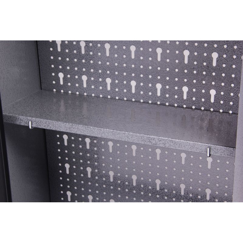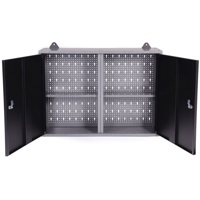 Šis metāla darbnīcas skapis ir nejutīgs, lai saskrāpētu . Darbnīcas skapis sastāv no diviem elementiem ar aizslēgtām durvīm . Darbnīcas skapja aizmugurējā siena ir nodrošināta ar eiro cauruma sienu , kas kalpo, lai piestiprinātu āķus skaidrai instrumentu glabāšanai.