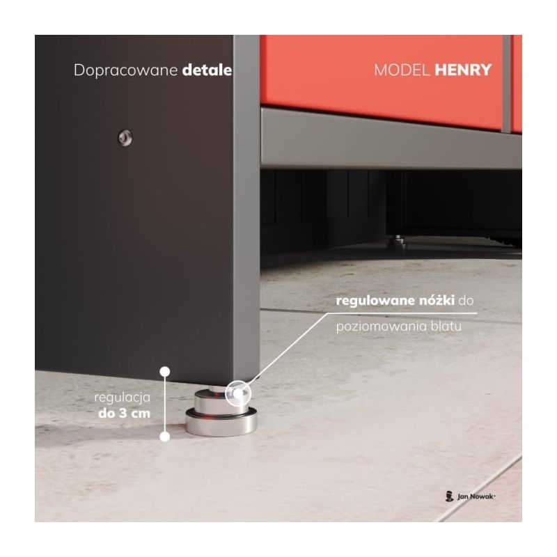 HENRY darba galds ir lieliska mēbele darbnīcai, amatniecības darbnīcai, noliktavai vai garāžai. Tas ir izgatavots no stipra tērauda, kas aizsargāts ar pulverkrāsu, kas lieliski darbojas sarežģītos apstākļos. Pat mitrā, neizolētā telpā uz tās virsmas neparādīsies rūsa. Darbagalds gadiem ilgi saglabāsies lieliskā formā. Papildu pārklājums aizsargā mēbeles, bet arī piešķir tām interesantu krāsu. Antracīta-zils darbagalds apvienojumā ar gaišu darba virsmu piešķirs telpai raksturu. Skapju profils un priekšpuse ir izgatavoti no 1,1 mm tērauda, atvilktnes - 1 mm, bet korpuss un citi elementi - 0,8 mm.