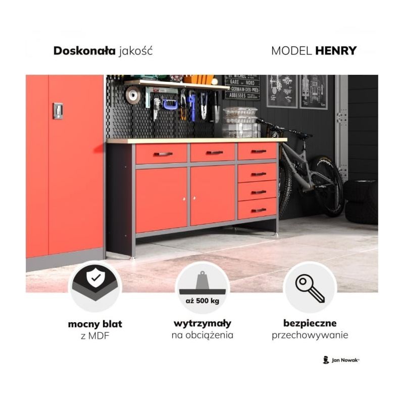 HENRY darbagalds ir modelis ar milzīgu darba virsmu. Tas viss savu unikālo izmēru dēļ. Darba virsma ir 60 cm dziļa un tās platums ir ievērojami pagarināts līdz 170 cm. Neatkarīgi no tā, vai veidojat mēbeles vai remontējat aprīkojumu, jums noteikti pietiks vietas saviem uzdevumiem.