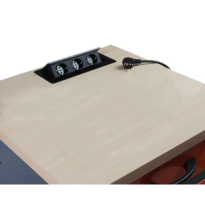 Metāla darba galds Werner, melns pelēks, izmēri aptuveni 120 x 60 x 85 H cm, kravnesība līdz 510 kg, darba virsma 28mm bieza, 2 slēdzamas durvis, 2 atvilktnes ar regulējamu augstumu, svars 60 kg. Schuko spraudnis.