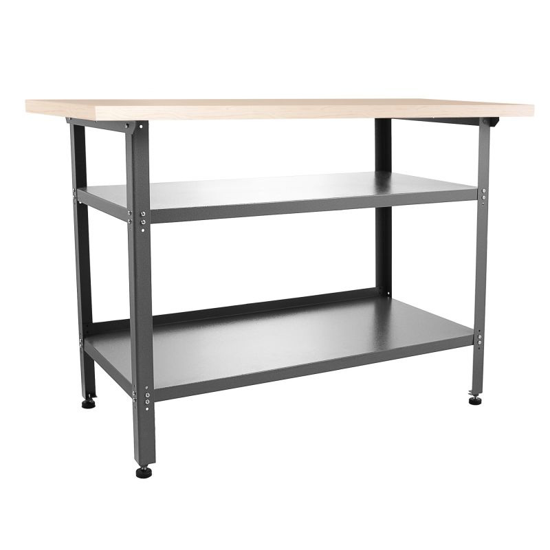 Izturīgais 120 cm garais koka dēlis ir 32 mm biezs un pārklāts ar melamīna pārklājumu, padarot to ārkārtīgi izturīgu! No koka un metāla izgatavotais darba galds var izturēt līdz 320 kg . Tomēr šis darbagalds sver tikai aptuveni 28,5 kg un ir mūsu vieglākais darbagalds, tāpēc to var pārvietot bez īpašas piepūles. Jūs varat viegli kompensēt nelielus grīdas nelīdzenumus, izmantojot regulējama augstuma pēdas .