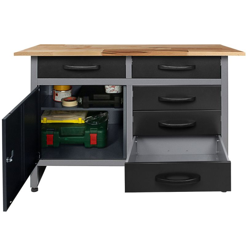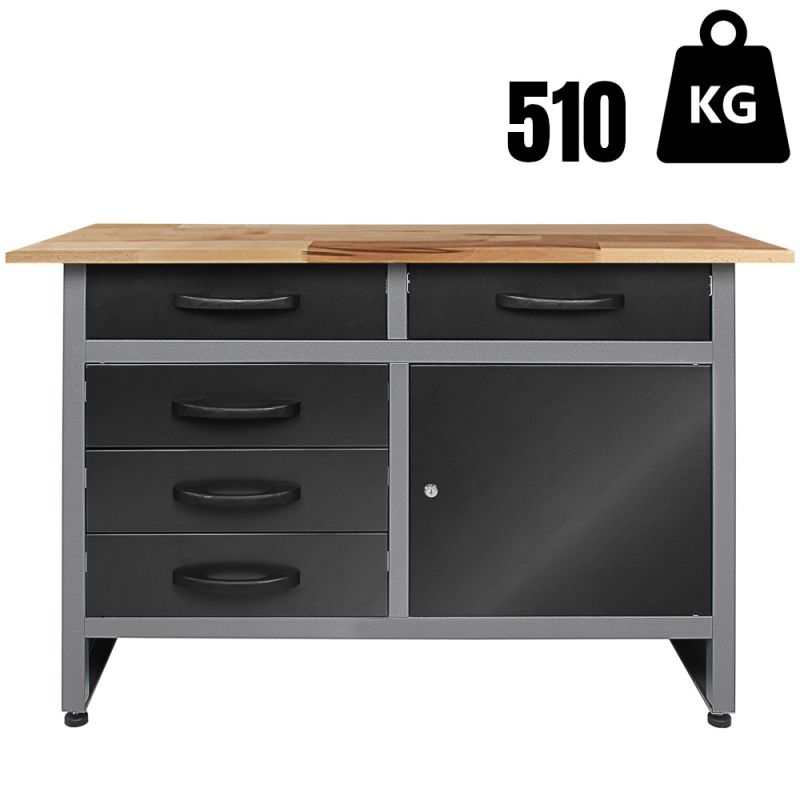 Koka darba virsma balstās uz metāla skapja: 120 cm gara un 28 mm dižskābarža koka darba virsma . Principā tas var izturēt jebko, kā arī piedāvā pietiekami daudz vietas instrumentiem, kas pašlaik tiek izmantoti. Darbagalds var izturēt kopējo slodzi 510 kg . Kopumā amatniecības galda izmēri ir aptuveni 120 (L) x 60 (W) x 85 (H) cm un sver aptuveni 80 kg. Tumši pelēkā krāsa nodrošina mūžīgu, neuzkrītošu dizainu katrā darbnīcā.