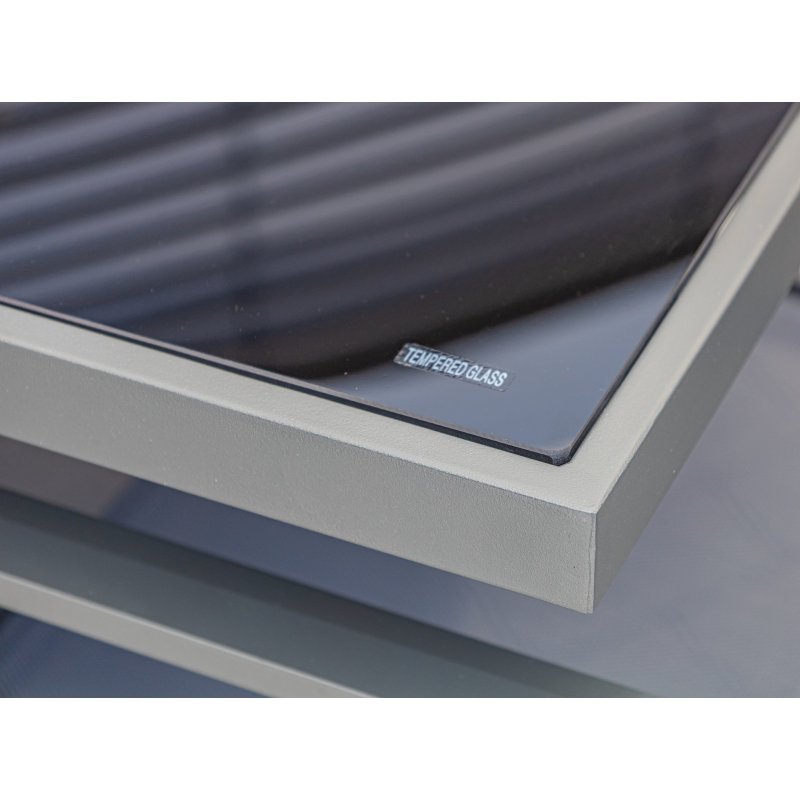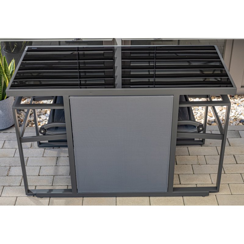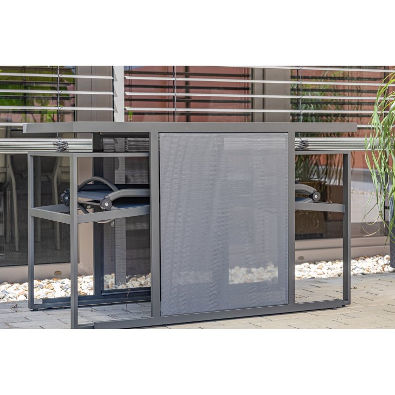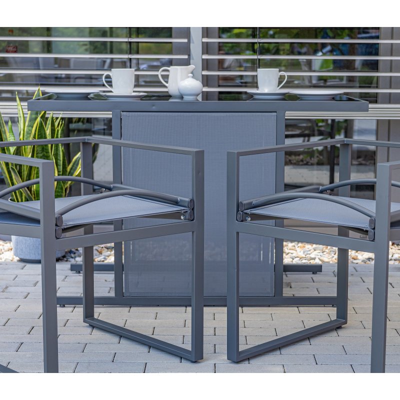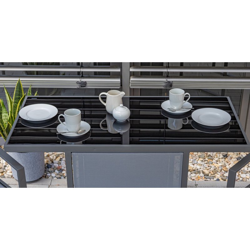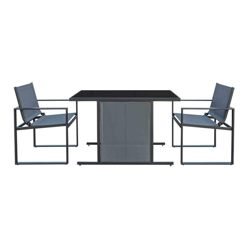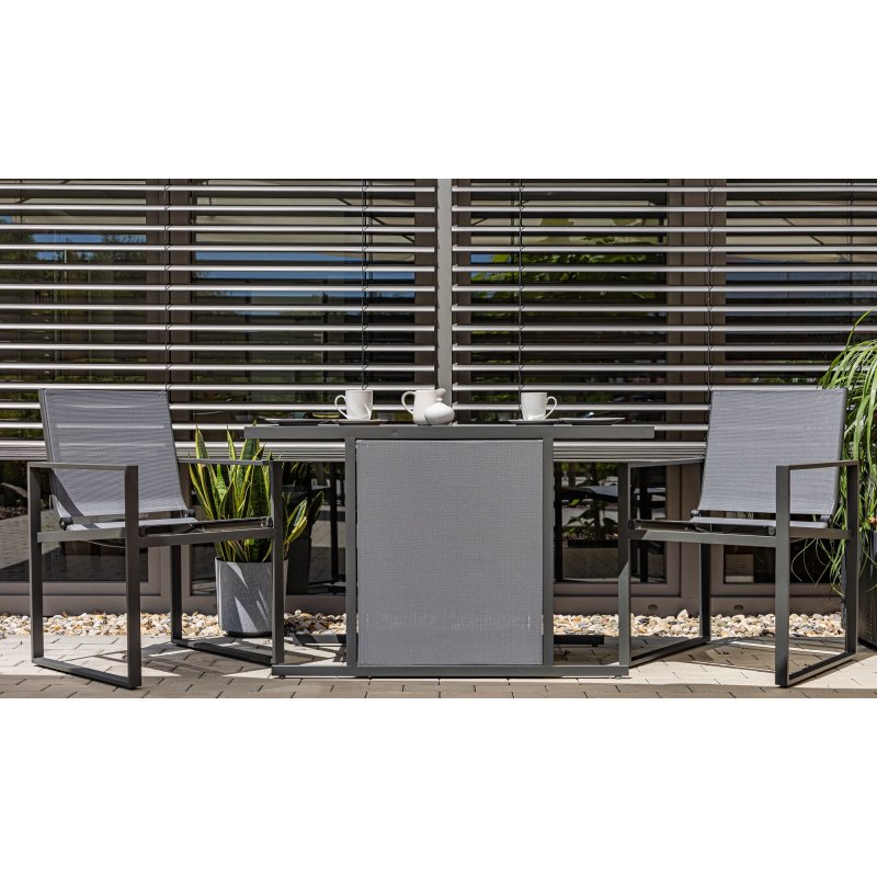 Šis elegantais trīsdaļīgs terases vakariņu komplekts sastāv no stilīga galda un diviem ērtiem krēsliem, un tas ir ideāls papildinājums jūsu āra zonai. Galda izmēri ir 117 x 58 x 73 cm, savukārt katra krēsla izmēri ir 53,5 x 84 x 57,5 cm, nodrošinot ērtu sēdēšanas augstumu. Izturīgais tērauda rāmis nodrošina stabilitāti un izturību, savukārt pelēkais 2*1 Textilene audums ir ne tikai vizuāli pievilcīgs, bet arī izturīgs pret laikapstākļiem. Galda virsma, kas izgatavota no 5 mm bieza, melni apdrukāta stikla, ir ne tikai viegli tīrāma, bet arī piešķir komplektam elegantu pieskārienu un harmoniski noapaļo dizainu. Lai komplektu uzglabātu vietu taupošā veidā, krēslus var viegli salocīt uz priekšu un novietot zem galda. Tas padara šo terases komplektu par ideālu izvēli pat ļoti mazam balkonam. Visi izmēri ir aptuveni un attiecas uz preces maksimālajiem ārējiem izmēriem. Sūtījuma svars arī ir aptuvens. Ja jums nepieciešama precīzāka informācija, lūdzu, sazinieties ar mūsu atbalsta komandu.