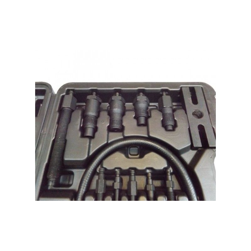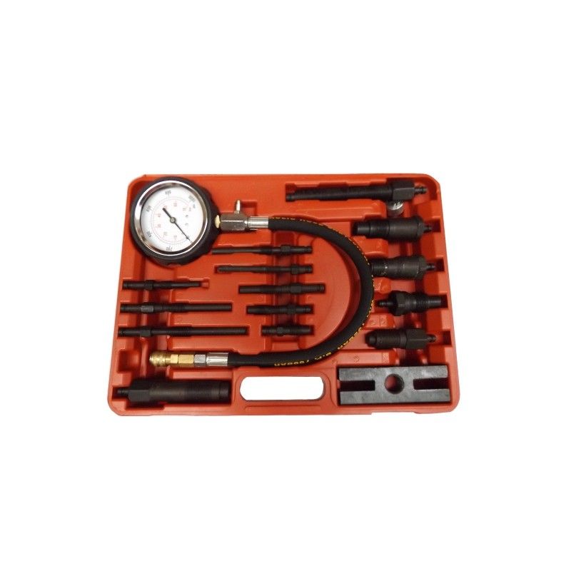 konstrukcija: materiāls C45 tērauds, melna virsma, melna oksidēta. Komplektā ietilpst spiediena mērītājs līdz 70 bāriem (1000 PSI) ar kabeli, ātro savienotāju un atbrīvošanas vārstu, 4 adapteri, kas uzstādīti injektora vietā, 9 adapteri, kas uzstādīti kvēlsveces vietā, viens universālais adapteris un H veida stiprinājums.