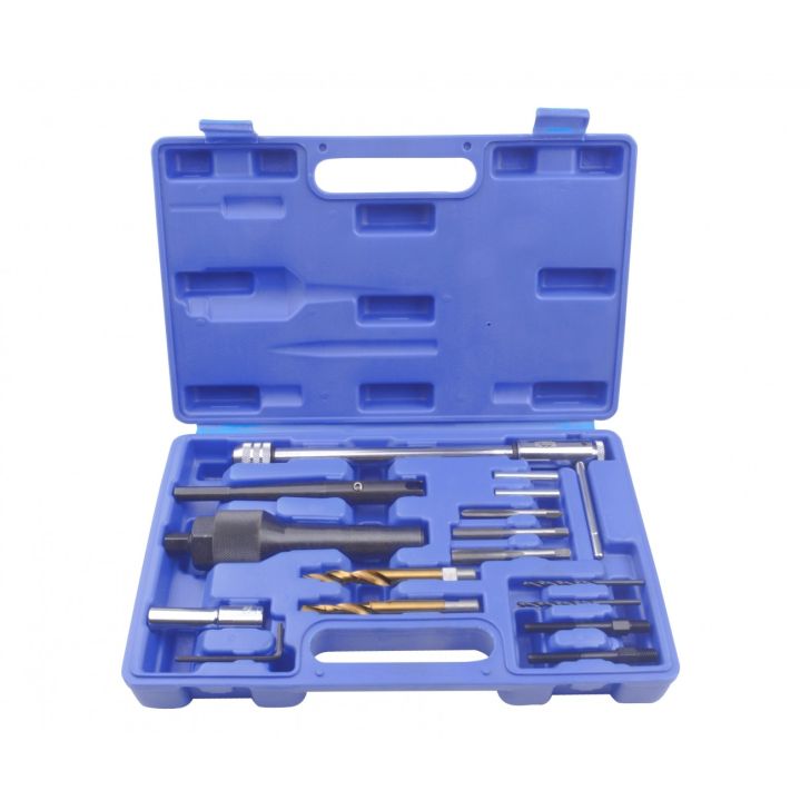 For broken glow plug 8mm and 10mm removal. Repair can be done without cylinder head removal necessity. In that case pneumatic adapter instead of injector is needed. Compressed air will not let glow plug leavings get into combustion chamber. Set containsall tools needed to safe glow plug removal and repair of thread in cylinder head.